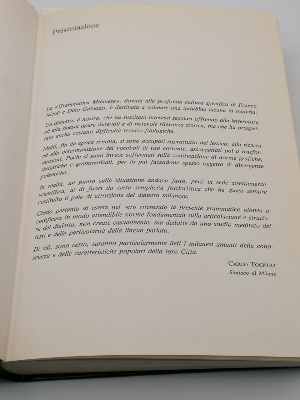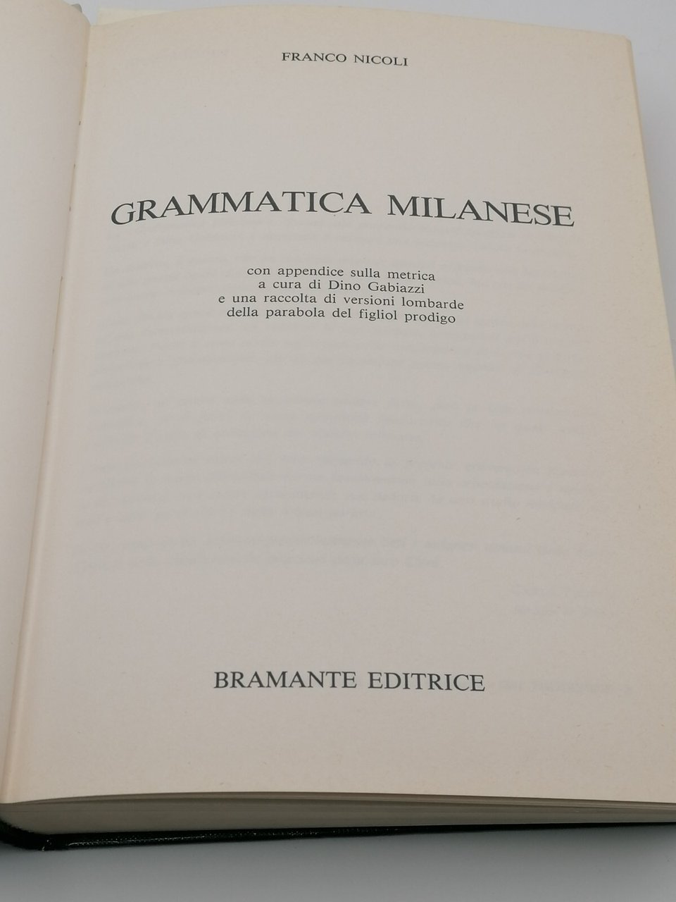 Grammatica milanesea cura di Franco NicoliEditore: Bramante Data di Pubblicazione: 1983 Pagine: 469 Formato: rilegato 1G-8-7 Descrizione Prima edizione 1983 in copertina rigida con appendice sulla metrica a cura di Dino Gabiazzi e una raccolta di versioni lombarde della parabola del figliol prodigoCondizioni del libro Ottime condizioni
