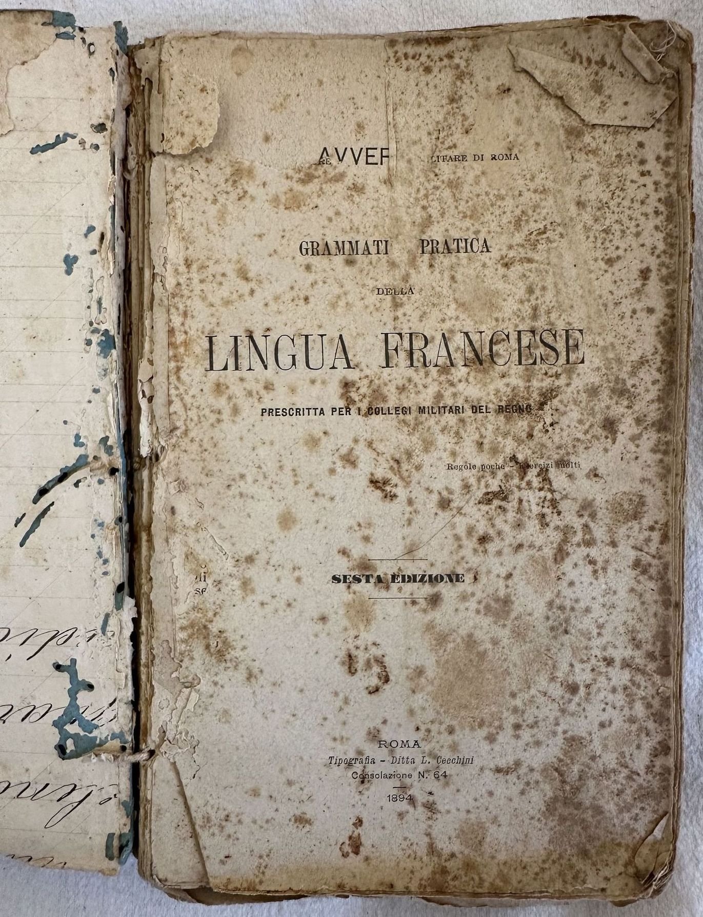Edizione del 1894 di questa grammatica della lingua francese per i collegi militari del Regno. All'interno: letture, nomenclatura, elementi, sintassi, fraseologia, vocabolario In mediocri condizioni. Copertina morbida coeva in mediocri condizioni generali con usure ai margini e dorso. Legatura quasi assente. All'interno le pagine si presentano in discrete condizioni con fioriture e segni di tarlo. In 8. cm 19,5x13. Pp. 511.Edition of 1894 of this gramamr of french language for military colleges of the Reign. Inside: readings, names, elements, syntaxis, sentences, vocabulary. In poor conditions. Copertina morbida coeva in mediocri condizioni generali con usure ai margini e dorso. Legatura quasi assente. All'interno le pagine si presentano in buone condizioni con fioriture. In 8. cm 19,5x13. Pp. 511. In good conditions. Soft coeval cover in poor general conditions lightly worn in the extremities. Binding almost lacks. Inside pages are in good conditions with foxing and worming.In 8. cm 19,5x13. Pp. 511.