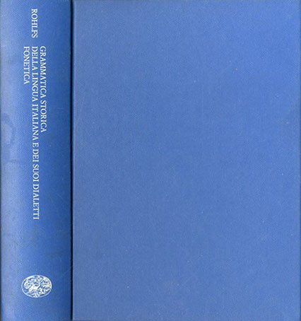 Rist. XXXVI, 520 p. ; 21 x 15 cm. Manuali di letteratura, filologia e linguistica, 3. La «Grammatica storica della lingua italiana e dei suoi dialetti» è un'opera, testo fondamentale per lo studio della lingua italiana, scritta dal filologo tedesco Gerhard Rohlfs in 3 volumi: «Morfologia», «Sintassi» e formazione delle parole e «Fonetica». L'opera venne pubblicata tra il 1949-1954 e tradotta in italiano da Einaudi negli anni 1966-1969. Traduzione di Salvatore Persichino. Legatura editoriale, coperta in cartone rigido colorato (blu), titolo impresso al dorso in bianco, muto il piatto (manca la sovraccoperta originale in carta). Qualche lievi segni del tempo al taglio della coperta, fioriture e piccole macchie, per il resto libro in buono stato. Codice libreria 5645.