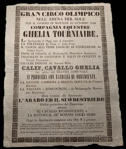 In folio (50×40 cm); foglio volante su bella carta azzurra. Esemplare in ottime condizioni di conservazione. Testo entro cornice xilografica. Manifesto per pubblicizzare la rappresentazione del noto circo Gran Circolo Olimpico bolognese che si esibiva nellArena del Sole di Bologna. Durante questa rappresentazione la protagonista fu la nota Compagnia Equestre Ghelia Tourniaire. Fra gli altri spettacoli: La Volteggia da Peter dAlbis Price; Il Cloon alli primi esercizj di equitazione da Achille Ciotti; Passi di Grazia da Madamigella Margherita Balestrati; Travaglio in Grotesco e Salti di oggetti da Felice Gotfroid; Giuochi Indiani da Angelo Bussi; Calif, Cavallo Ghelia che agisce nel Teatro Comunale si produrrà con esercizj di obbedienza; La Grande Carriera a briglia sciolta da Federico Brennier; La Paesana Borgognese da Madamigella Marcherita Balestrati; Darà termine allo Spttacolo LArabo ed il suo destriero; Fatica particolare del Direttore ossia Il Cavallo Riconoscente; La Battaglia de Beduini cogli Arabi; Salvo Superiore permesso Compagnia Equestre darà due grandiose corse di Cavalli e bighe né Pubblici Giardini detti La Montagnola nellandante Mese. La qualità dello Spettacolo, il giorno e lora in cui avranno luogo, verrà indicato con apposito Manifesto. In fondo al volume è presente uninteressante nota a stampa. N. B. Chi amasse prendere Scuola di Equitazione e di Volteggia potrà combinare con Direttore pel giorno pel prezzo, e per lora allArena stessa. Esemplare in ottime condizioni di conservazione. Raro manifesto.