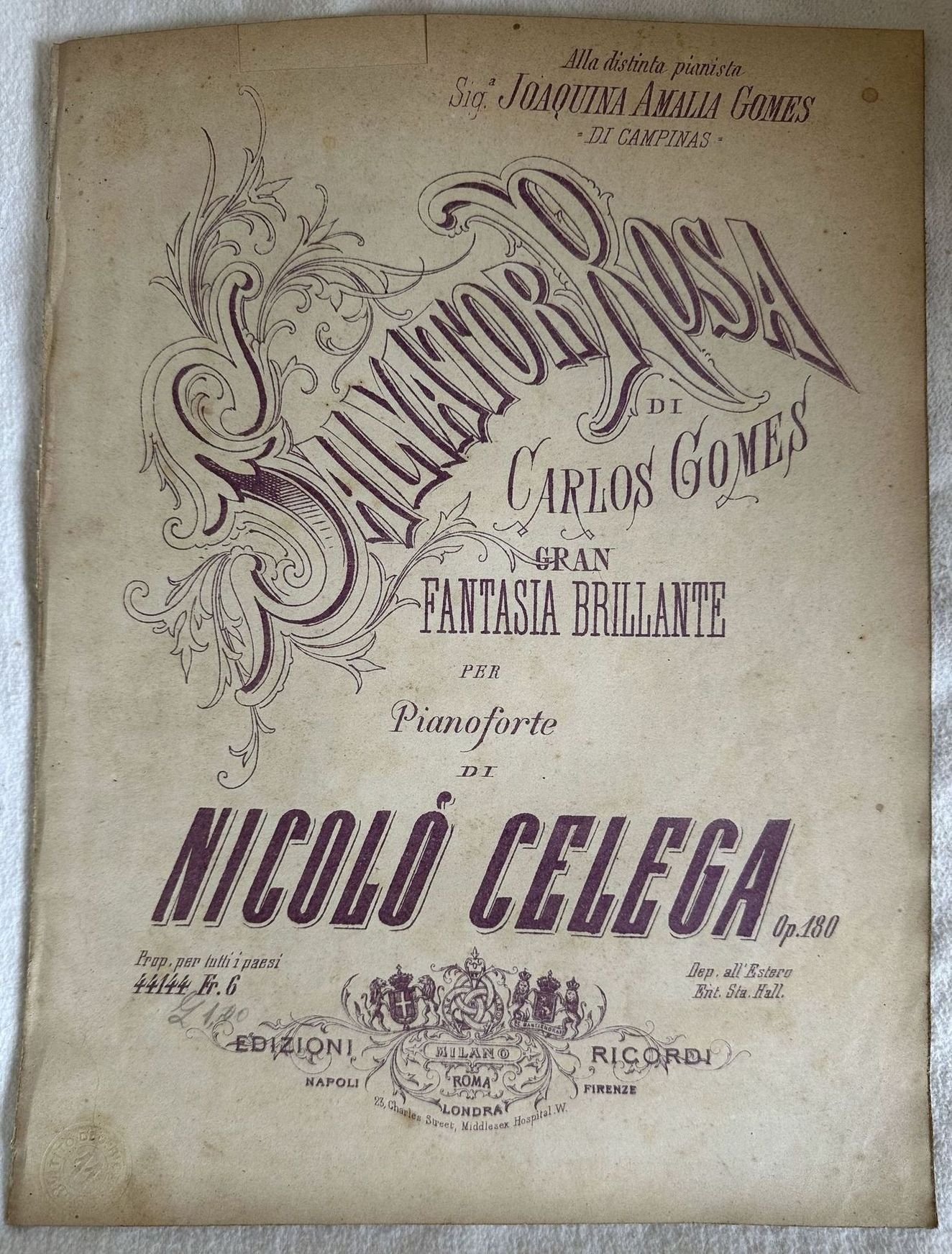 Edizione Ricordi del 1876 della melodia per pianoforte "Salvator Rosa Gran Fantasia Brillante per pianoforte" dall'opera 180 di Nicolò Celega. In buone condizioni. Copertina editoriale in buone condizioni generali con lievi usure ai margini e dorso. Legatura in discrete condizioni. Pagine in buone condizioni con fioriture. In folio. cm. 33,5x25,5. Pp. 25.Ricordi edition of 1876 of this musical score for piano "Salvator Rosa Gran Fantasia Brillante per pianoforte" from the opera 180 by Nicolò Celega. In good conditions. Binding is missing. In folio. cm. 33,5x25,5. Pp. 25.