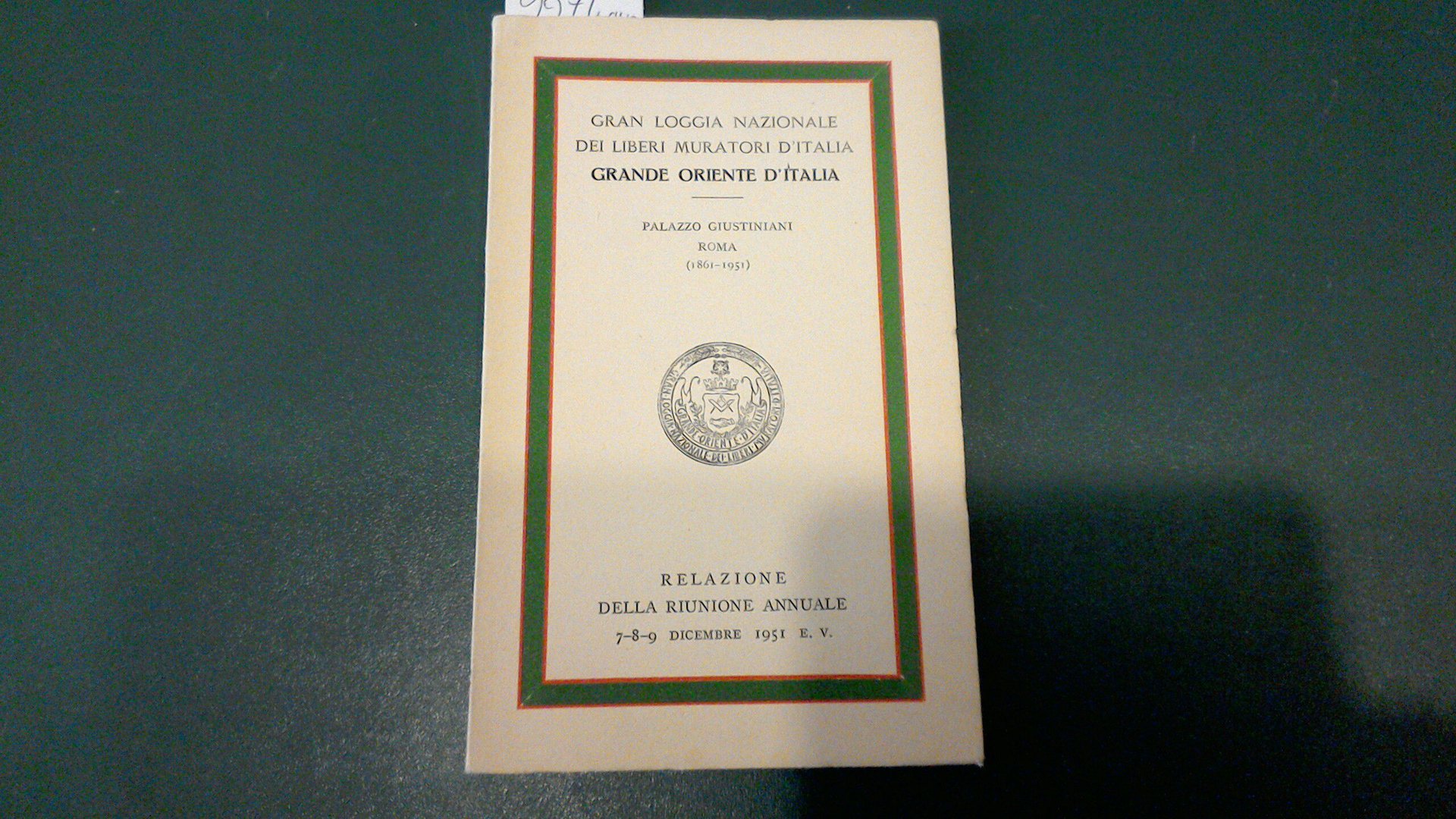 Relazione della riunione, tenuta a Roma nel Dicembre 1951, in occasione dei 90 anni dell'Unità d'Italia, dei membri della Gran Loggia Nazionale dei Liberi Muratori d'Italia.