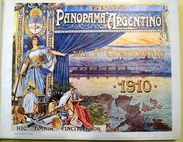 Album cm. 48 x 26. Composto di circa 400 pagine, ognuna con un’illustrazione, 28 dei queste stampate a colori. Le tavole rappresentano vedute, ritratti di personaggi celebri e scene della storia argentina, le immagini sono racchiuse in cornici tipografiche di vari colori. Tela editoriale rossa con titoli oro sul primo piatto. Esemplare in ottimo stato.