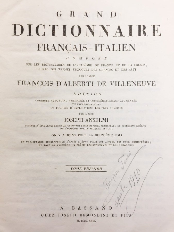 Grand dictionnaire francais-italien / Grande dizionarioitaliano-francese. Composto sui dizionari dell'Accademia di Francia, della Crusca, ed arricchito di tutti i termini proprj delle scienze e delle arti. Edizione notabilmente corretta, migliorata ed accresciuta [.] per opera del sacerdote Giuseppe Anselmi. Tome premier [-secondo].