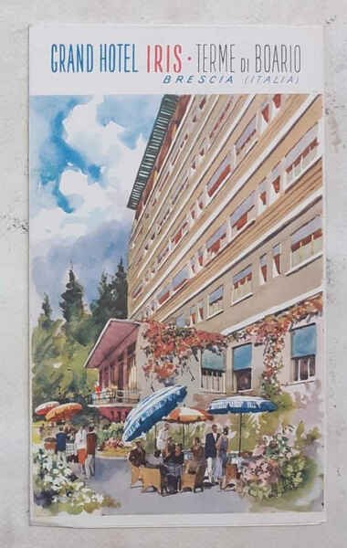 Pieghevole di 10 facciate di cm. 18,5 x 11; con numerose belle illustraz. grafiche a colori anche a doppia pagina (interni, esterni, l'Hotel con vista verso la Presolana.) e copertina a colori di G. Frattini. Allegato listino prezzi. VG.