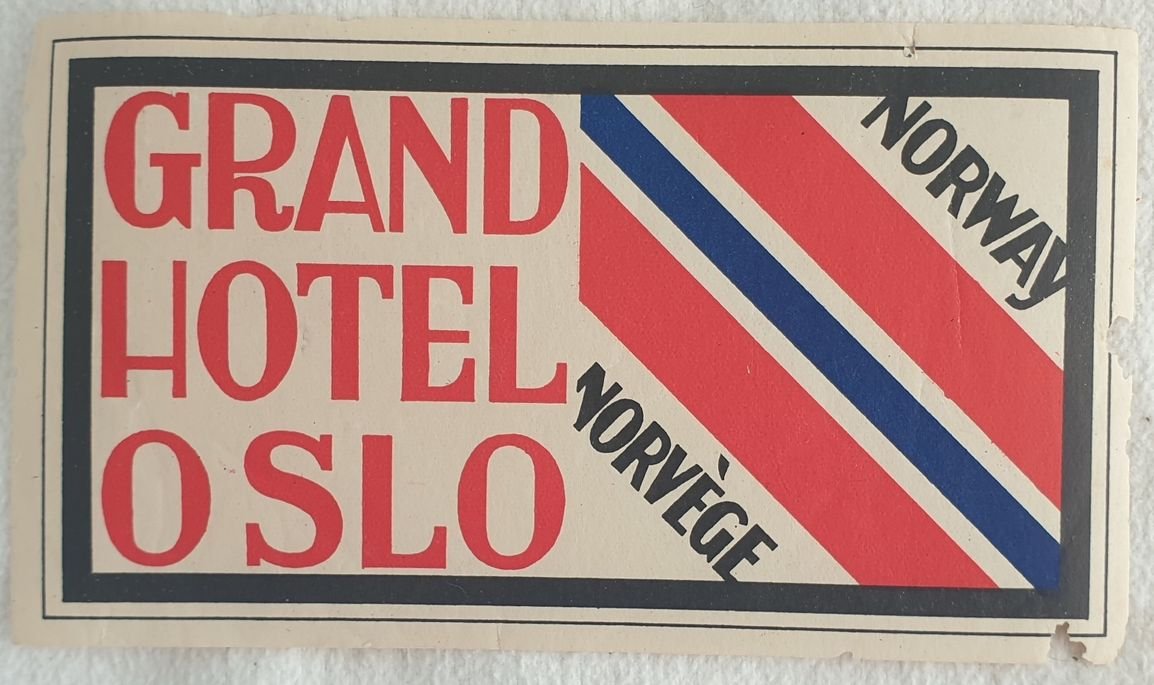 Bella etichetta per valigia dell'albergo "Grand Hotel Oslo" in Norvegia degli anni '40 circa. In ottime condizioni. Formato cm. 8x14,5. Beautiful luggage labels of 1940's circa of the Grand Hotel Oslo" in Norway In very good conditions. Size cm. 8x14,5.