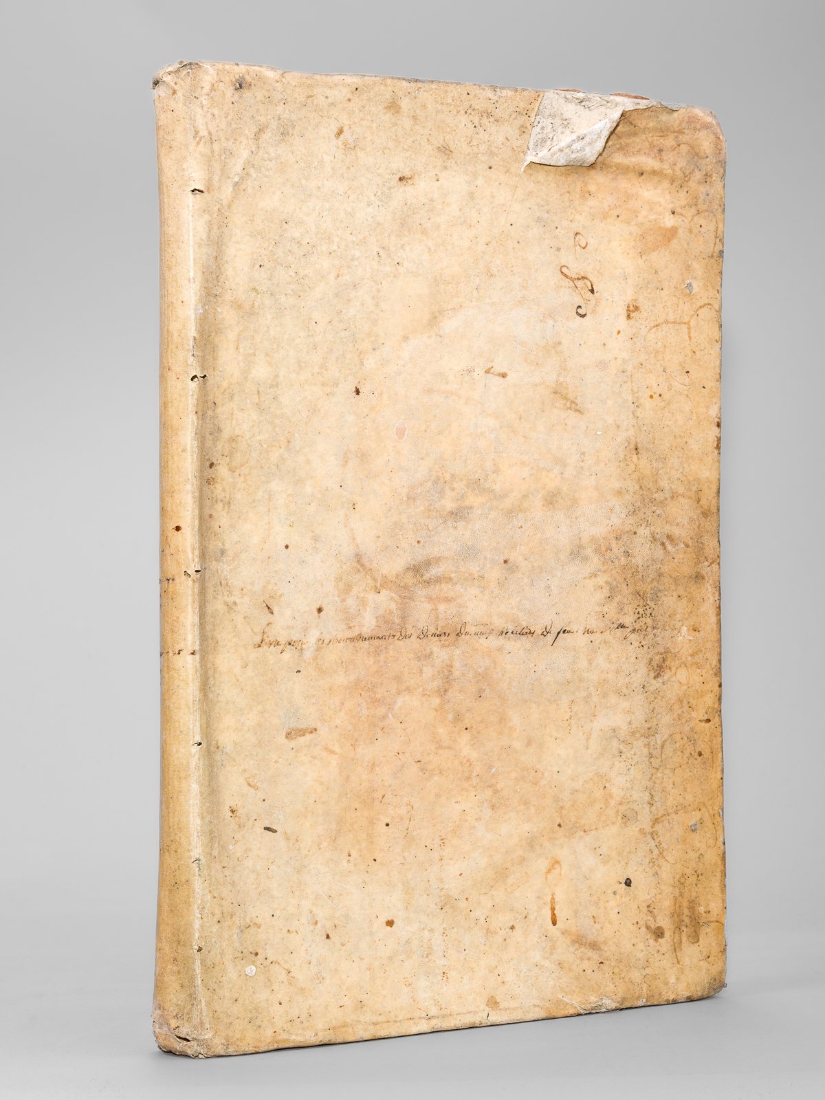 Registre in-folio reliure d'époque plein vélin, 68 feuillets format 46,8 x 30,5 cm, distance de 28 mm entre les pontuseaux, filigrane vertical à fleur de lys de 44 mm et horizontal : [ DANGOUMOIS ? ], avec timbre "Registre, La Loi Le Roi" justice assise [ circa 1791 ] Ce registre en partie débroché conserve encore 68 beaux feuillets vierges timbrés en tête. La belle étiquette du libraire d'Epierris contrecollée en garde précise notamment qu'il vendait du "Papier d'Angoulême et Registre de toutes grandeurs et qualité". Raymond Depierris ou de Pierris ou d'Epierris, comme il signait, vint s'établir à Niort vers 1755. Il était relieur et doreur de livres, mais il tenait aussi dans son magasin de la rue du Palais, près du puits Nalliers, la papeterie, les livres de piété, les cartes, estampes, etc., bagage ordinaire des libraires de province avant la Révolution. En 1791, il ouvrit une imprimerie et l'exploita jusqu'à sa mort (1793) arrivée dit un état officiel de la préfecture, dans les Guerres de Vendée (Clouzot, Notes pour servir à l'histoire de l'Imprimerie à Niort, 121). Prix en l'état pour ce registre dont le beau papier vergé trouvera facilement son remploi.
