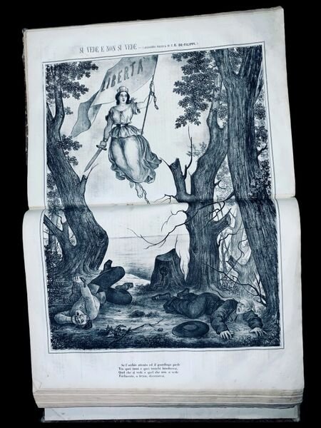 1861-1862: Prima due annate rilegate in legatura coeva in mezza pelle con titolo al dorso. 30 numeri, tutto il pubblicato, dal 6 giugno al 24 dicembre, tutti i numeri presentano 8 pagine a parte due numeri che ne contiene 12. Prima della raccolta presenti una brossura rosa illustrata, una carta con titolo e annata entro cornice ed una carta (con strappo ma senza perdita di carta) con il titolo illustrata. Seguono (rinforzo al margine esterno bianco della prima ed ultima carta del primo numero e al centro di un numero per ridurre uno strappo). Lannata si chiude con una brossura rossa satirica illustrata.1862 Tutto il pubblicato. Brossura verde illustrata, seguono, dal primo numero della seconda annata uscito il 4 gennaio allottantaduesimo ed ultimo numero uscito il 24 dicembre. Tutti i numeri sono formati da 8 pagine a parte tre numeri che presentano 12 pagine. 1863-1864: Terza e quarta annata, rilegate in mezza pelle con titolo e fregi in oro al dorso. 1863, Anno III, n. 1 (1 gennaio 1863) n. 135 (31 dicembre 1863) compreso supplemento al 122 e al 124, 1864 Anno IV, n. 136 (7 gennaio 1864) n. 187 (29 dicembre 1864). L'ultimo numero del 1864 presenta uno strappo con perdita di carta alla terza carta dell'ultimo numero, il 187. Due annate complete1868 Tutto il pubblicato. Dal primo numero dellannata, il 344 del 2 gennaio allultimo numero dellanno, il 396 uscito il 31 dicembre. Legatura in mezza tela con piatti foderati da carta marmorizzata coeva (qualche difetto ai piatti). Allinterno in ottime condizioni di conservazione. Tutti i numeri sono formati da 8 pagine. Alla fine del volume sono raccolte tutte le brossure editoriali di ogni numero di colore paglierino e arancione. 1869 Tutto il pubblicato. Dal primo numero dellannata, il 397 del 6 gennaio allultimo numero dellanno, il 448 uscito il 30 dicembre. Legatura in mezza tela con piatti foderati da carta marmorizzata coeva (qualche difetto ai piatti). Allinterno in ottime condizioni di conservazione. Tutti i numeri sono formati da 8 pagine.1870 Tutto il pubblicato (a parte 5 numeri, il 469, il 483, il 485, il 487, il 498 mai aggiunti in questa collezione). Dal primo numero dellannata, il 449 del 6 gennaio allultimo numero dellanno, il 500 uscito il 29 dicembre. Legatura in mezza tela con piatti foderati da carta marmorizzata coeva. Allinterno in ottime condizioni di conservazione.1872 Tutto il pubblicato a parte i numeri 580 e 603. Dal primo numero dellannata, il 553 del 4 gennaio allultimo numero dellanno, il 604 uscito il 26 dicembre. Due strappetti alle prime tre carte dellultimo numero, restaurati, senza perdita di carta. Legatura in mezza tela con piatti foderati da carta marmorizzata coeva (qualche difetto ai piatti). Allinterno in ottime condizioni di conservazione. Tutti i numeri sono formati da 8 pagine, a parte un numero che è composto di 4 pagine.1873 Tutto il pubblicato a parte i numeri 622, 623, 629, . Dal primo numero dellannata, il 605 del 2 gennaio allultimo numero dellanno, il 656 uscito il 25 dicembre. Due strappetti alla prima pagina del primo numero senza perdita di carta. Legatura in mezza tela con piatti foderati da carta marmorizzata coeva (qualche difetto ai piatti). Allinterno in ottime condizioni di conservazione. Tutti i numeri sono formati da 8 pagine, a parte un numero che è composto di 4 pagine.<BR>1874 Tutto il pubblicato. Dal primo numero dellannata, il 657 del 1 gennaio allultimo numero dellanno, il 709 uscito il 31 dicembre. Legatura in mezza tela con piatti foderati da carta marmorizzata coeva (qualche difetto ai piatti). Allinterno in ottime condizioni di conservazione. Tutti i numeri sono formati da 8.<BR>1875 tutto il pubblicato. Entro carpetta con lacci. Dal primo numero dellannata, il 710 del 7 gennaio allultimo numero dellanno, il 761 uscito il 30 dicembre. Tutti i numeri presentano 12 pagine la prima e lultima carta sono alcuni di brossura arancione, alcuni rosa e gli altri gialli). Varie tavole a colori, numerosi numeri ancora a fogli chiusi. I numeri si presentano ancora a fogli chiusi.1876 tutto il pubblicato. Entro carpetta con lacci. Dal primo numero dellannata, il 762 del 6 gennaio allultimo numero dellanno, il 813 uscito il 28 dicembre. Tutti i numeri presentano 12 pagine (la prima e lultima carta sono in brossura paglierina). Varie tavole a colori, numerosi numeri ancora a fogli chiusi. Varie tavole a piena pagina in cromolitografia a colori (qui compare anche il primo ritratto della Galleria Cromolitografica dello Spirito Folletto). I numeri si presentano ancora a fogli chiusi.1877 tutto il pubblicato. Entro carpetta con lacci. Dal primo numero dellannata, il 814 del 4 gennaio allultimo numero dellanno, il 865 uscito il 27 dicembre. Tutti i numeri presentano 12 pagine (la prima e lultima carta sono alcuni di brossura arancione e gli altri gialli). Varie tavole a colori, numerosi numeri ancora a fogli chiusi. 1878 tutto il pubblicato. Entro carpetta con lacci. Dal primo numero dellannata, il 866 del 3 gennaio allultimo numero dellanno, il 917 uscito il 26 dicembre. Tutti i numeri presentano 12 pagine (la prima e lultima carta sono alcuni di brossura arancione e gli altri gialli). 1879 tutto il pubblicato. Entro carpetta con lacci. Dal primo numero dellannata, il 970 del 1 gennaio allultimo numero dellanno, il 969 uscito il 25 dicembre. Tutti i numeri presentano 12 pagine (la prima e lultima carta sono di brossura marroncino). 1880 tutto il pubblicato. Entro carpetta con lacci. Dal primo numero dellannata, il 918 del 2 gennaio allultimo numero dellanno, il 1022 uscito il 30 dicembre. Tutti i numeri presentano 12 pagine (la prima e lultima carta sono di brossura paglierina). Quasi tutti i numeri sono a fogli chiusi e presentano una grande tavola a colori. 1881 tutto il pubblicato. Entro carpetta con lacci. Dal primo numero dellannata, il 1023 del 6 gennaio allultimo numero dellanno, il 1074 uscito il 29 dicembre. Tutti i numeri presentano 12 pagine (la prima e lultima carta sono di brossu