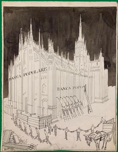 53x40,5 cm; disegno a china. Bellissimo disegno satirico del celebre pittore modenese Mario Vellani-Marchi (Modena, 1895 Milano, 1979) allievo di Giuseppe Graziosi e Pio Semeghini allAccademia di Belle Arti di Modena. Nei primi anni della sua attività artistica è tra gli illustratori dei più importanti giornali satirici modenesi come il Duca Borso, Cavalli e non , il Marchese Colombi, il Gatto Bigio ed altri. Nel 1924 viene invitato per la prima volta alla Biennale di Venezia dove tornerà per altre 11 volte. Nel 1925 è con Orio Vergani e Riccardo Bacchelli uno dei fondatori del cenacolo artistico di Via Bagutta a Milano dopo essersi da poco trasferito nella città meneghina. Il disegno realizzato a china vede diversi individui lavorare al Duomo di Milano portando allinterno oggetti per i lavori. Sulla facciata e sulla fiancata in realizzazione la scritta Banca Popolare. Inedito e realizzato intorno al 1920, il disegno mette in luce gli stretti legami fra la celebre banca milanese e la chiesa cattolica. Proprio in quegli anni a capo della banca milanese cera il celebre politico, giornalista e banchiere, Filippo Meda (Milano, 1º gennaio 1869 Milano, 31 dicembre 1939) che fu una figura chiave del movimento cattolico italiano tra la fine del XIX° secolo e la prima metà del XX° secolo. Nel 1920 Meda venne insediato alla direzione della celebre banca milanese da Giolitti che gli assegnò, anche, il dicastero del Tesoro (si sarebbe poi dimesso lanno dopo dal Tesoro per dedicarsi completamente alla Banca Popolare alla quale prestò i suoi apprezzati servigi per 7 anni). La Banca Popolare di Milano nacque con l'intento di creare una cooperativa di credito capace di assicurare ai propri soci una sostenibilità e una competitività di fronte alla crescente forza dell'alta borghesia nella crescita industriale che caratterizzava la fine dell'Ottocento nel capoluogo lombardo. La caratteristica popolare, che già aveva avuto successo in Germania e in Belgio, fu sicuramente ispiratrice per la vicina Banca Popolare di Lodi di Tiziano Zalli, amico del fondatore di BPM, Luigi Luzzatti. Lo stesso Zalli si disse affascinato dal testo di Luzzatti: "La diffusione del credito e le banche popolari" del 1863, fonte di spunti per la nascita della prima banca popolare italiana, la Banca Mutua Popolare Agricola di Lodi. Fu proprio Luzzatti, il 28 ottobre 1864 a comunicare a Zalli l'esistenza a Milano di un comitato promotore per una banca popolare cittadina.