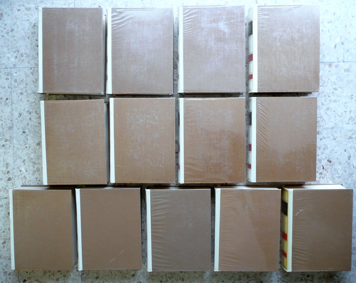 AA. VV., Salvatore Battaglia, Grande dizionario della lingua italiana Volumi I - XIII UTET, Torino 1961-86, cm 30x23; pp. VIII-952 (vol. I); pp. 1004 (vol. II); pp. 1096 (vol. III); pp. 1044 (vol. IV); pp. 1058 (vol. V); pp. 1084 (vol. VI); pp. 1086 (vol. VII); pp. 1038 (vol. VIII); pp. 1046 (vol. IX); pp. 1032 (vol. X); pp. 1102 (vol. XI); pp. 1144 (vol. XII); pp. 1146 (vol. XIII), legatura in mezza pelle con titolo e fregi impressi in oro al dorso. Condizioni di conservazione Volumi tutti ben conservati con tracce di utilizzo; sovraccoperte ed. in acetato con alcuni piccoli lievi aloni e difetti; qualcuna con mancanze e strappetti anche di vari cm principalmente in corrispondenza del dorso. Volumi complessivamente molto ben conservati, con poche minuscole abrasioni a qualche dorso e cuffia. Interni buoni, complessivamente molto ben conservati; risguardi / alcune pagine di qualche volume con lievi - minimi accenni d'ingiallimento ai margini. Volumi I - XIII. A causa dell'elevato peso complessivo dell'opera, la spedizione potrà essere effettuata unicamente tramite due pacchi ordinari (anche servizio crono"). EXTRA.0028 "