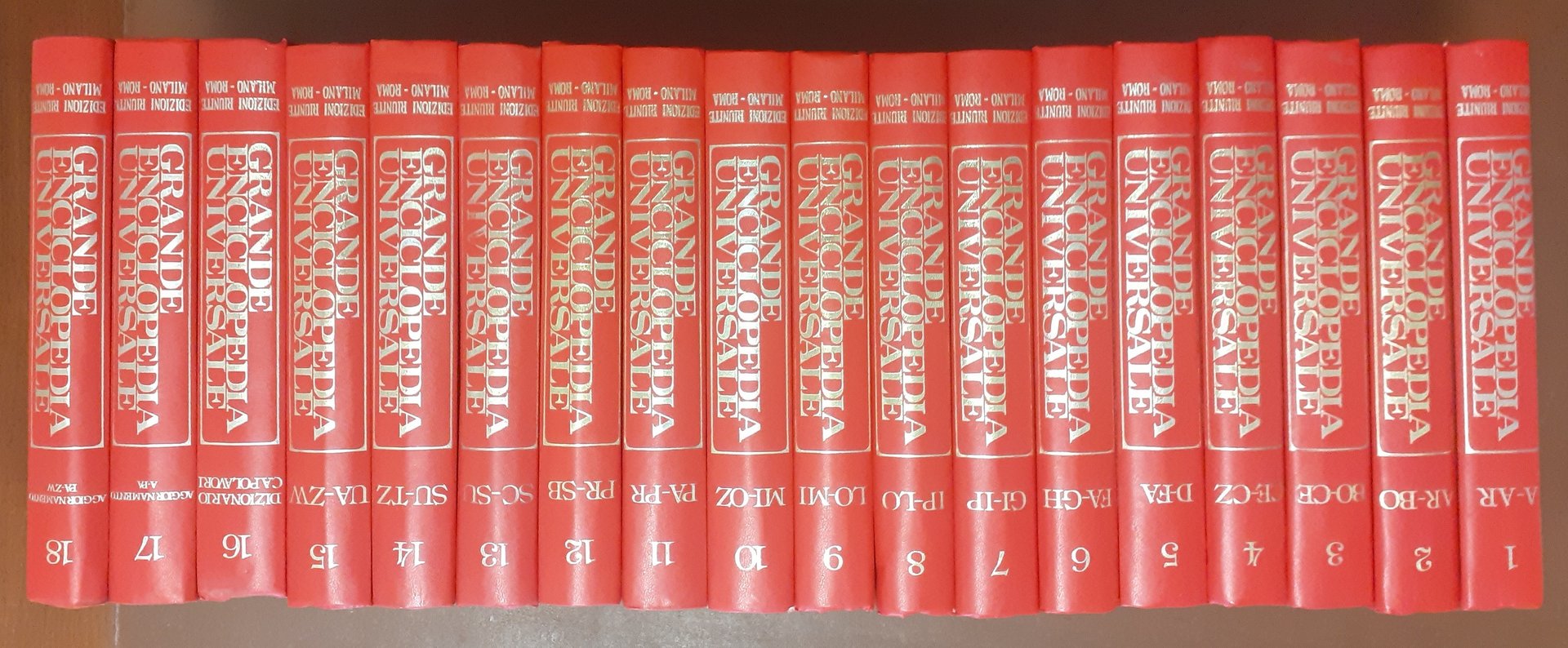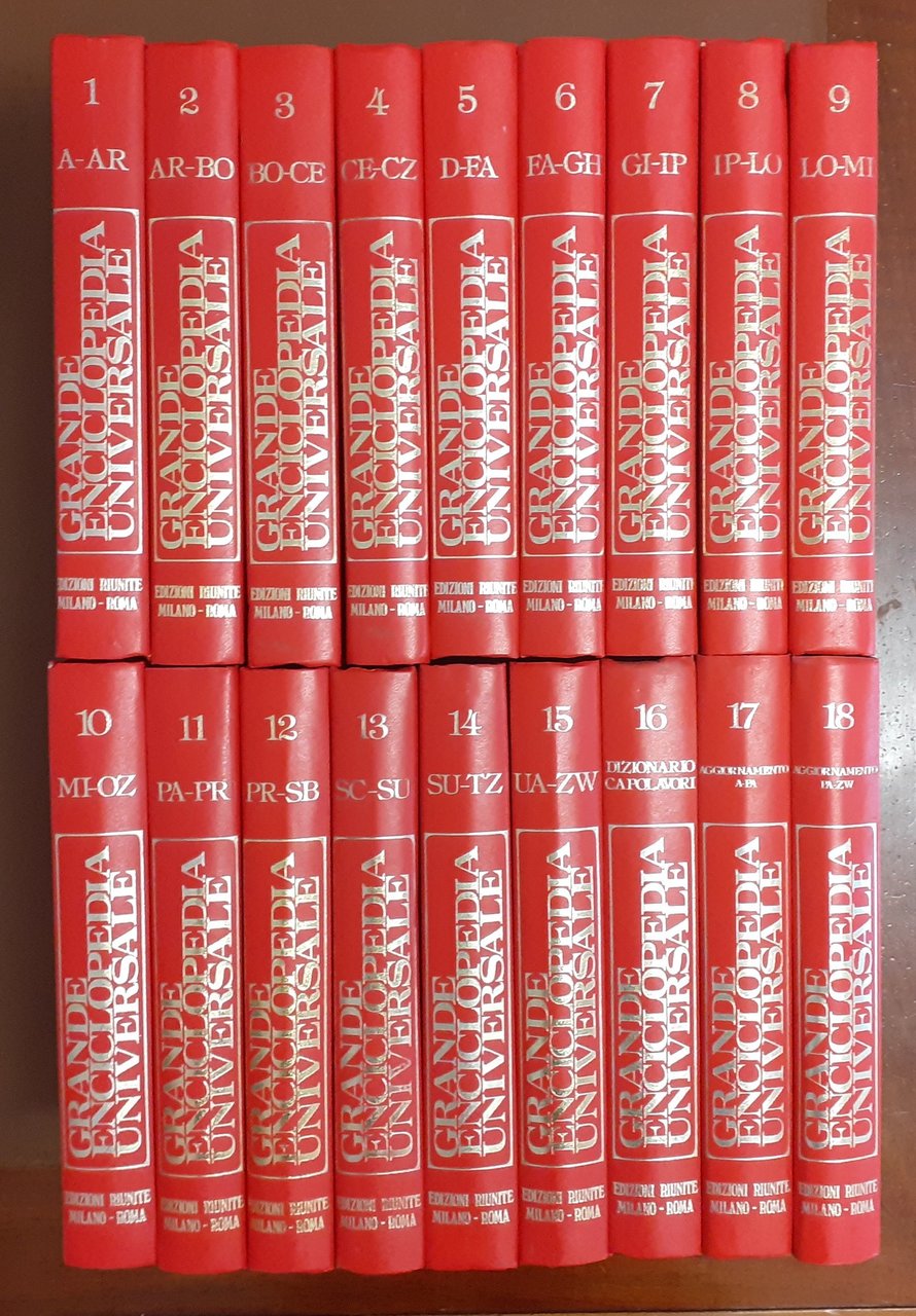 Grande enciclopedia universale delle lettere, delle scienze, delle arti, diretta da Armando Curcio, Edizioni Riunite (European Book S.p.A.), Milano-Roma 1985, 18 voll., pp. totali 7172, ill. b.n. e col., cm 25, legatura ed. in similpelle con titoli al dorso e al piatto. Dettaglio opera. Vol. I: A-Ari, pp. 396. Vol. II: Ari-Bop, pp. 397-796. Vol. III: Bor-Cer, pp. 805-1236. Vol. IV: Cer-Cz, pp.1237-1614. Vol. V: D-Far, pp. 1621-2052. Vol. VI: Far-Ghi, pp. 2053-2416. Vol. VII: Gi-Ipo, pp. 2421-2820. Vol. VIII: Ipo-Lom, pp. 2821-3182. Vol. IX: Lon-Mir, pp. 3189-3572. Vol. X: Mir-Oz, pp. 3573-3983. Vol. XI: P-Pro, pp. 3989-4420. Vol. XII: Pro-Sb, pp. 4421-4828. Vol. XIII: Sc-Suc, pp. 4837-5236. Vol. XIV: Sud-T, pp. 5237-5596. Vol. XV: U-Z, pp. 5605-5987. Vol. XVI: Dizionario dei capolavori, pp. 5991-6438. Vol. XVII: Aggiornamento. A-Pad, pp. 372. Vol. XVIII: Aggiornamento. Pak-Z, pp. 373-734. Minimi segni del tempo su alcuni dei volumi, per il resto perfetti.
