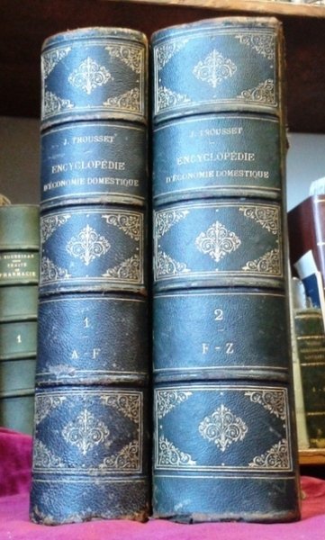 Due volumi in 8 legati in mezza pelle e tela, dorsi ornati a quattro nervi, titolo al tassello ai dorsi, sguardie marezzate, bianche, occhielli, frontespizi, 2388, 2780 colonne (1194, 1390 pp.). Il secondo tomo termina con la parola Xiphias, nome di un particolare pesce, mancando del tutto la lettera Z (ed in parte, probabilmente anche il restante della lettera X). La legatura, coeva, non denuncia carenze dell'impaginazione, mentre l'ultimo quaderno, il 324, risulta mancante di una carta. Probabilmente rilegato nello stato in cui era stato rinvenuto. Rammarico per la non completezza, ma nel contempo si pu gioire della vera e propria miniera di ricette, scoperte, invenzioni, formule, distillati di conoscenza reperibili in quest'opera veramente enciclopedica. Ricette e preparazioni di succulente portate, nozioni e notizie sugli ingredienti e sul modo di confezionare, un tourbillon di notule sugli svariati aspetti dell'economia domestica e rurale. Cosa dire di pi? Si pu reperire in questa Caverna di Al Bab ogni sorta di utile consiglio, dall'ago alla nave. Veramente interessante, intrigante e 'succulento' (per le molte centinaia di ricette che vi si leggono), non comune, in buone condizioni di conservazione (un poco lisa e stanca la legatura, con piccole mancanze), con CIRCA DUEMILA SILOGRAFIE NEL TESTO su tutti i temi trattati.