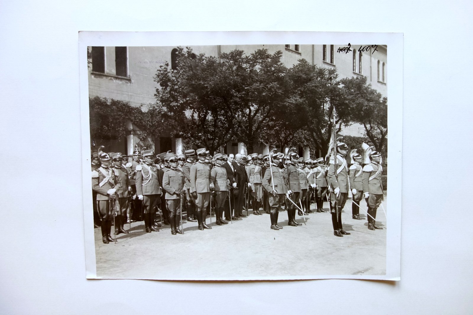 Grande fotografia, Celebrazione Ufficiali e militari del Regio Esercito Italiano in alta uniforme anni '20 - '30 del Novecento circa Stabilimento Fotografico de l'Ambrosiano, s. d. ma anni '20 - '30 del Novecento circa; grande fotografia originale in b/n; al retro timbri recanti i dati del fotografo. Cm 23,5x30. Condizioni di conservazione Esemplare complessivamente in buono stato con tracce d'uso, leggermente rifilato; angoli inferiori con minimi accenni di pieghette; margine destro e sinistro entrambi con un minuscolo forellino. SC03.D17828 N