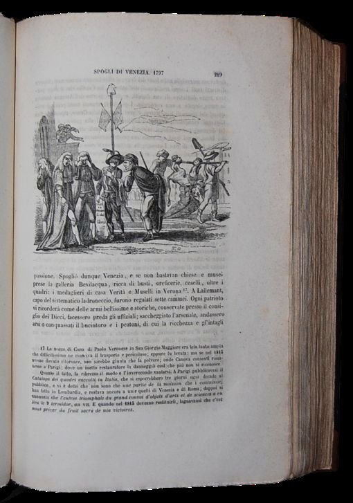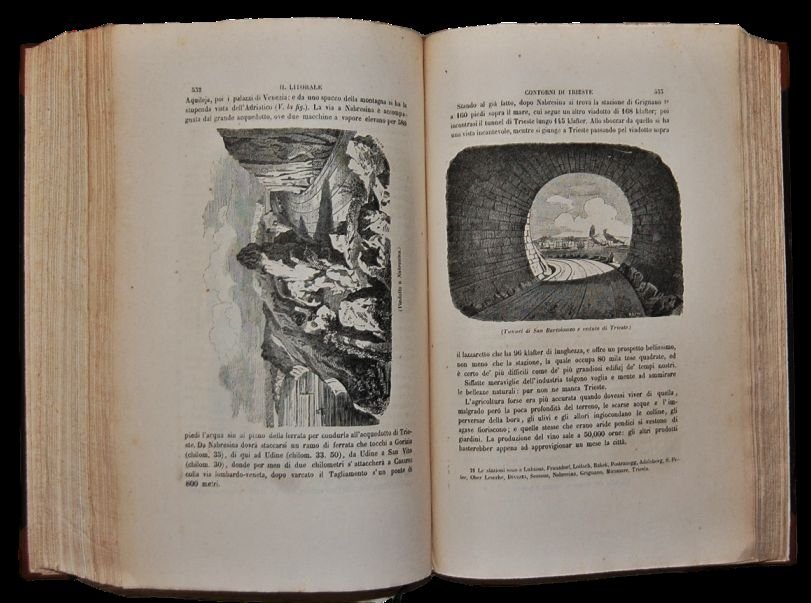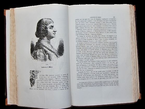 In 4°; 6 tomi: (2 frontespizio inciso), 839, (9) pp. e una pianta di Milano a doppia pagina, una c. di tav. più volte ripiegata, una c. di tav. fuori testo con dedicatoria al Professore Pietro Carpanelli; 830 pp. (frontespizio inciso in antiporta), 9 c. di tav. fuori testo con ritratti (Federico Borromeo, Canova, Carlo Goldoni, Tiziano, S. Carlo Borromeo, Torquato Tasso, Cesare Beccaria, Alessandro Volta, Bernardino Luino), una carta a doppia pagina con veduta di Venezia, 4 c. di tav. (altra veduta a volo d'uccello a doppia pagina di Venezia, Candelabro di Andrea d'Alessandro bresciano, Monumento del Tiziano), 1 c. di tav. con dedicatoria a Tommaso Catullo; 1244 pp.; 1014, (2) pp. (ma 1042 pp., frontespizio architettonico incluso e errore di numerazione con numerazione da 296 a 304 ripetute due volte e altre 7 pagine non numerate fra le quali dedicatoria a Aleardo Aleardi, cioè 304, (7), 296-1014) e 4 c. di tav. fuori testo con ritratti (Plinio Secondo, Girolamo Tiraboschi, Scipione Maffei, Andrea Palladio), pianta della città di Padova a doppia pagina; 1091, (1) pp. frontespizio inciso incluso e 5 c. di tav. con ritratti (Eugenio di Savoja, Antonio Zanon, Antonio Rosmini, Giuseppe de Maistre, Andrea Mantegna), una pianta a doppia pagina della Città di Mantova; 791, (1) pp. e 2 c. di tav. con ritratti (Giorgio Trissino, Alessandro Vittoria). Nell'opera sono presenti 6 front. allegorici incisi, 7 tavv. f.t., di cui 5 topografiche, 977 illustrazioni nel testo, alcune anche a piena pagina con vedute, scene di vita, costumi e fregi ornamentali. Prima non comune edizione completa della più importante opera storico geografica ottocentesca dedicata al territorio ed alla storia del Lombardo-Veneto. Belle legature coeve in mezza pelle scura con titolo, numero dei volumi con loro contenuto, filetti e fregi in oro e a secco al dorso. Piatti foderatati con carta coeva. Piccolo ed ininfluente tunnel di tarlo al margine basso bianco (solo nel primo frontespizio architettonico tocca la cornice) delle prime 5 carte del primo tomo che poi diventa un forellino piccolissimo fino a pagina 64 del tutto ininfluente. Esemplare ad ampi margini, in parte a fogli chiusi ed in barbe. L'opera si presenta solitamente brunita e con fioriture diffuse mentre in quest'esemplare sono presenti solo poche pagine leggermente ed uniformemente brunite, sempre ininfluenti e nessuna fioritura. Nel complesso l'opera è in ottime condizioni di conservazione. Il primo volume contiene la descrizione del territorio di Milano e Pavia, il secondo di Venezia e Belluno, il terzo di Brescia, Cremona e Como, il quarto di Padova, Verona e Vicenza, il primo volume del quinto tomo di Valtellina, Mantova, Lodi, Bergamo e Crema, il secondo volume del quinto tomo di Rovigo, Udine e Treviso. Ampio spazio è dedicato alle località di villeggiatura dei grandi laghi che si trovano in questo territorio come il lago di Como ed il Lago di Garda. Ottimo esemplare. Cfr. Cremonini 164 che cita solo 17 ritratti fuori testo invece dei 20 qui presenti. Catalogo Hoepli, 593: "Opera delle più interessanti e compiute per quel tempo, che illustra le regioni del Lombardo-Veneto sotto tutti gli aspetti, storico, artistico, culturale, economico, ecc".