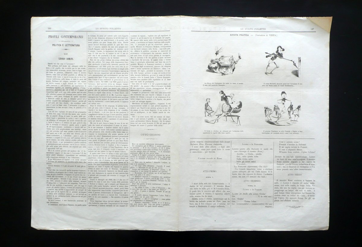 Grande litografia, Costumi nazionali - Campagna Romana pagina centrale de Lo Spirito Folletto" S. d. (1860 circa); bifolio di pp. 4, con una grande litografia su due pagine e alcune ill. in b/n nel t. Non completo. Cm 44x31. Condizioni di conservazione Esemplare ben conservato con tracce d'uso, leggere tracce di pieghe di conservazione, piccole lievi bruniture, angoli con lievi tracce di pieghette. SC03.D15139 N F "