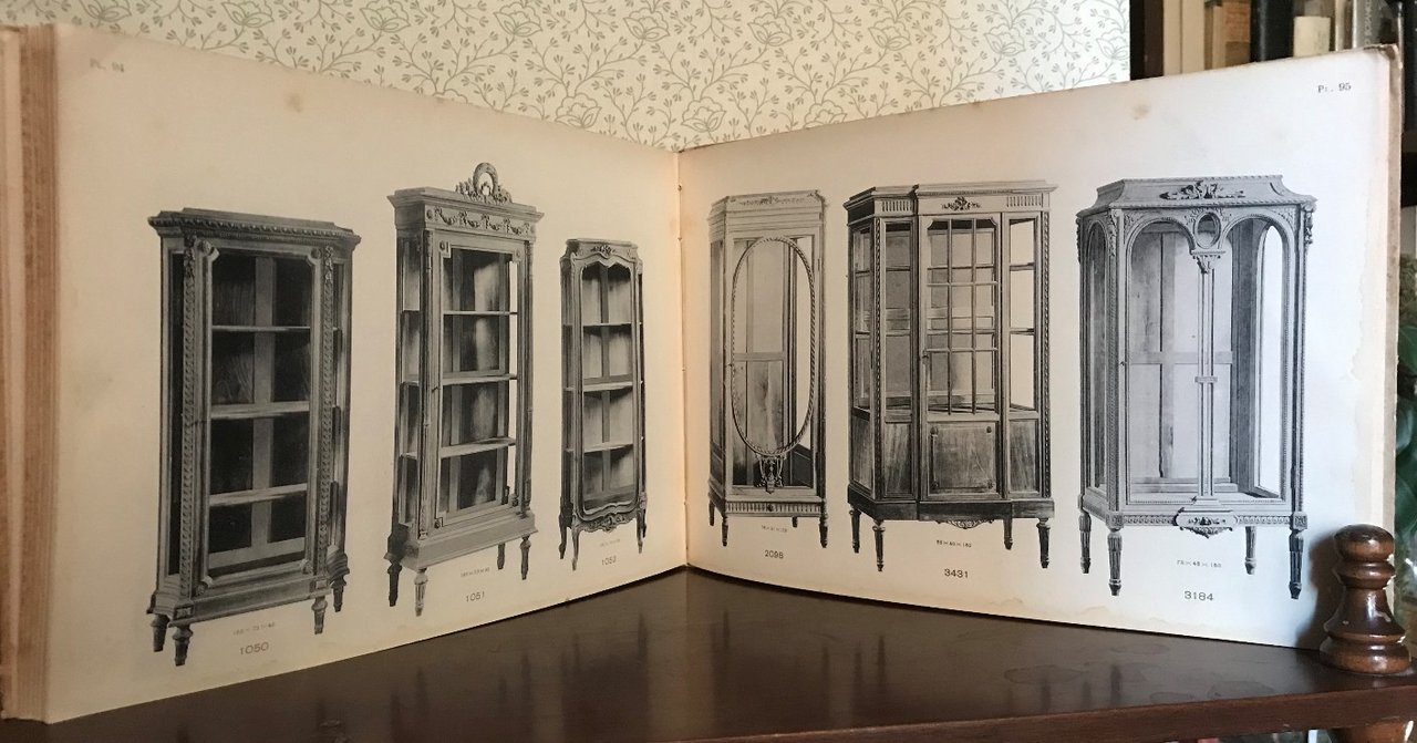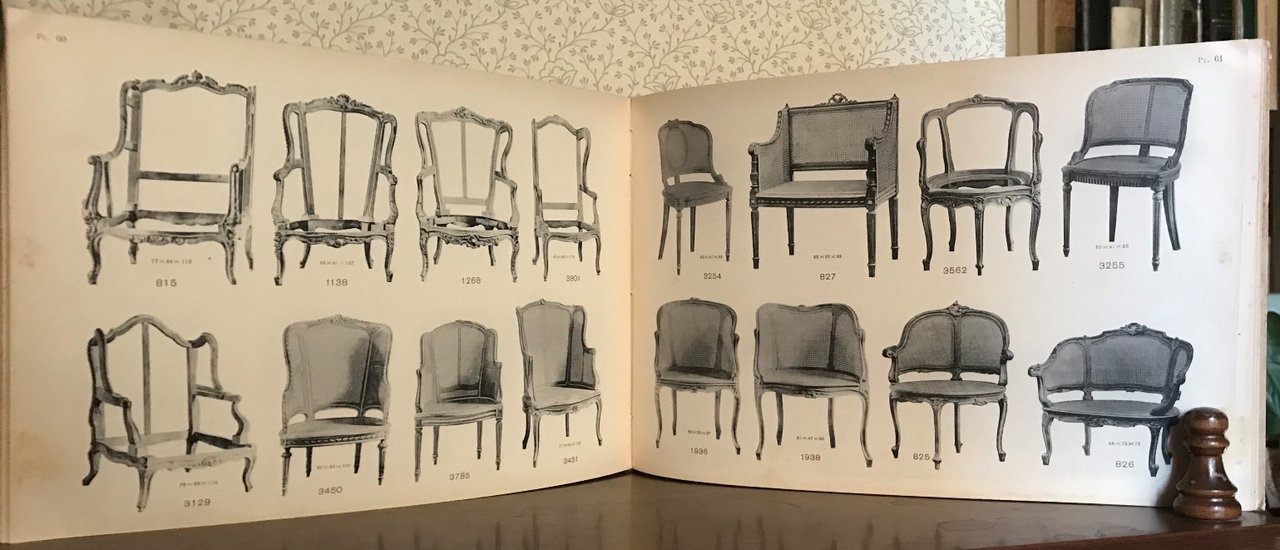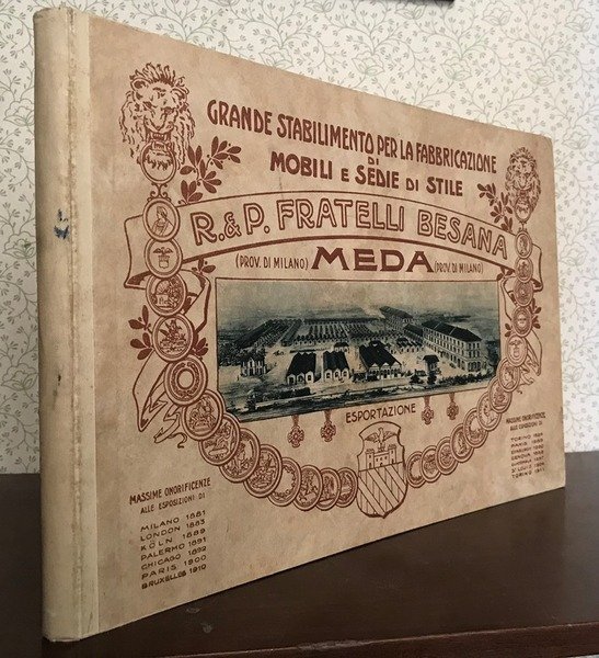 Volume in 4 oblungo, mezza tela editoriale, piatto anteriore ornato e figurato (veduta della fabbrica al centro), sguardie, 96 pp. con le illustrazioni dei mobili (sedie, tavoli, divani, mobili vari) prodotti dalla Ditta. Non v' testo, solo, sotto ogni singolo manufatto, sono riportate le misure dello stesso. Catalogo sicuramente databile intorno al primo ventennio del novecento. In perfetto stato, poco comune.