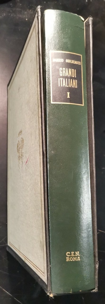GRANDI ITALIANI volume 1 di Guglielmotti Centro editoriale nazionale CEN, 1970. Marconi, Soffici, Ducati, Papini, D'Annunzio, Puccini, Pirandello ecc. 669 pagine, foto in bianco e nero fuori testo. Copertina editoriale in tutta finta pelle e cofanetto in cartone telato rigido. Stato di conservazione: molto buono (manca la parte superiore del cofanetto)