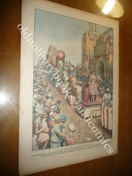 DESCRIZIONE: Domenica del Corriere, Milano, Anno XXVII n. 41 (11 ottobre 1925). COPERTINA: Le grandi manovre nel canavese. Un gruppo di poderosi Tanks apre il varco alle fanterie. RETRO: Concorso Miss America ad Atlantic City. La Domenica del Corriere è stato un popolare settimanale italiano fondato a Milano nel 1899 e chiuso nel 1989. Apparve per la prima volta nelle edicole l'8 gennaio 1899 come supplemento illustrato del Corriere della Sera. Stampata in grande formato (sul modello del domenicale La Tribuna illustrata), aveva 12 pagine e veniva distribuita gratis agli abbonati del Corriere, oppure si poteva acquistare in edicola per 10 centesimi. La prima e ultima di copertina erano sempre disegnate. Il Corriere si avvaleva di un giovane disegnatore, Achille Beltrame, allora sconosciuto, a cui veniva affidato in ogni numero il compito di rendere con la sua tavola il fatto più interessante della settimana. Dopo la sua morte nel 1945, fu sostituito da Walter Molino che, come il suo predecessore, firmò memorabili copertine. A differenza dei settimanali dell'epoca, la Domenica del Corriere diede ampio spazio alle fotografie e ai disegni, e questo fu uno dei motivi del suo successo. CONDIZIONI: Ottime senza azzurrina. PESO / WEIGHT: 200 gr. without package