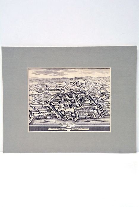 15,5X17,5 Cm. Gravure avec blason du plan numéroté ou d’une vue numérotée de la ville de Zug ou Zoug appartenant à une série de 20 gravures de plans et vues de la Suisse au XVIIème. 1-La grande Eglife de Saint-Ofwald. 2-Eglife paroiffiale de Saint Michel. 3-Capucins. 4-Religieufes. Très bon état, vendue avec sa marie-louise.