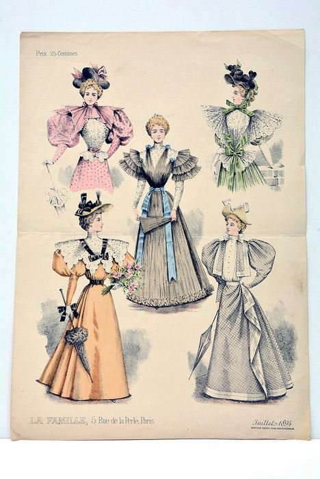 Gravure signée de toilettes de femmes. Revue La Famille, 5 rue de la Perle, Paris. Gravure inédite du numero de juillet 1894.