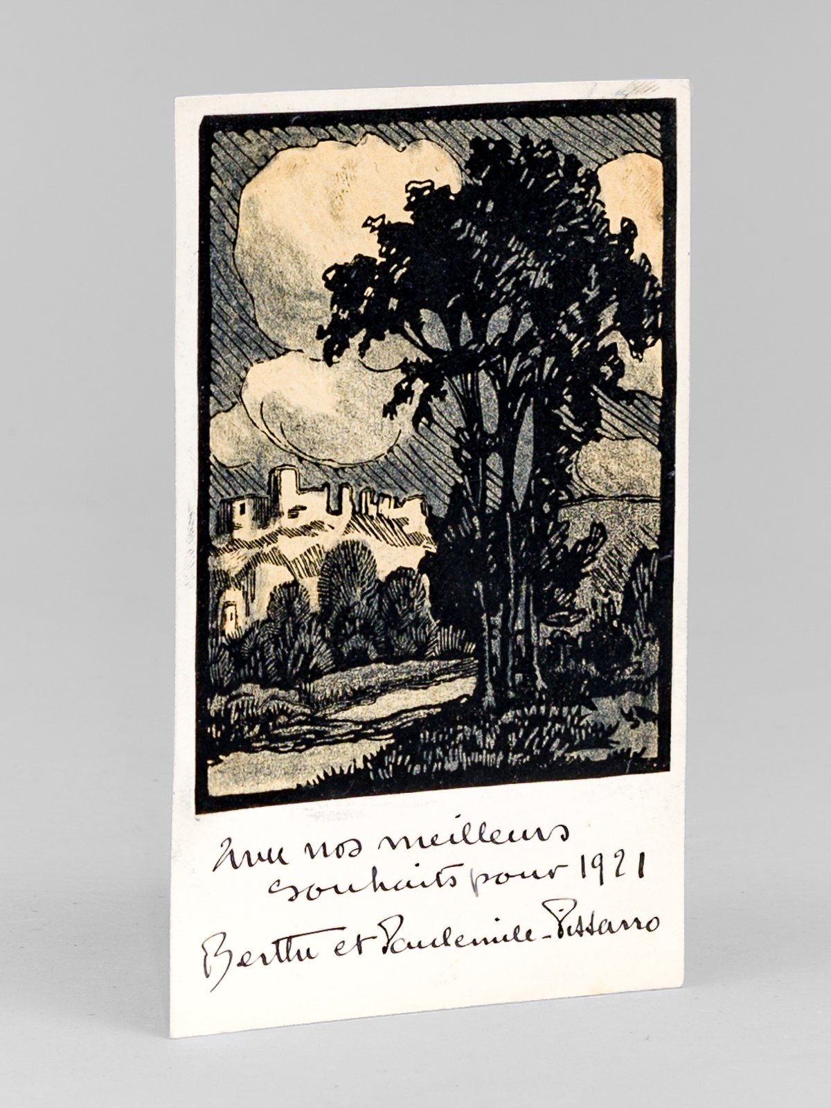 1 carte postale format 14 x 9 cm avec estampe sur papier fin (papier de soie ?) contrecollé (dimension 10, 3 x 8,3 cm), mention autographe signée de l'artiste : "Avec nos meilleurs souhaits pour 1921 Berthe et Paul-Emile Pissarro) Très belle gravure en couleurs, avec texte et signature autographe de Paul-Emile Pissarro (me cinquième et dernier fils de Camille Pissarro). La carte est adressée à Monsieur et Madame Andro, 40 rue des Saints-Pères, les héritiers de la fonderie Allard. Fine original engraving signed by his handby Paul-Emile Pissarro, with his autograph wishes for 1921.