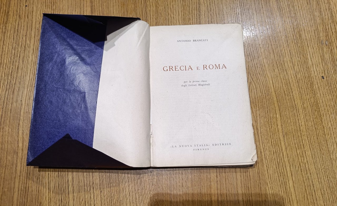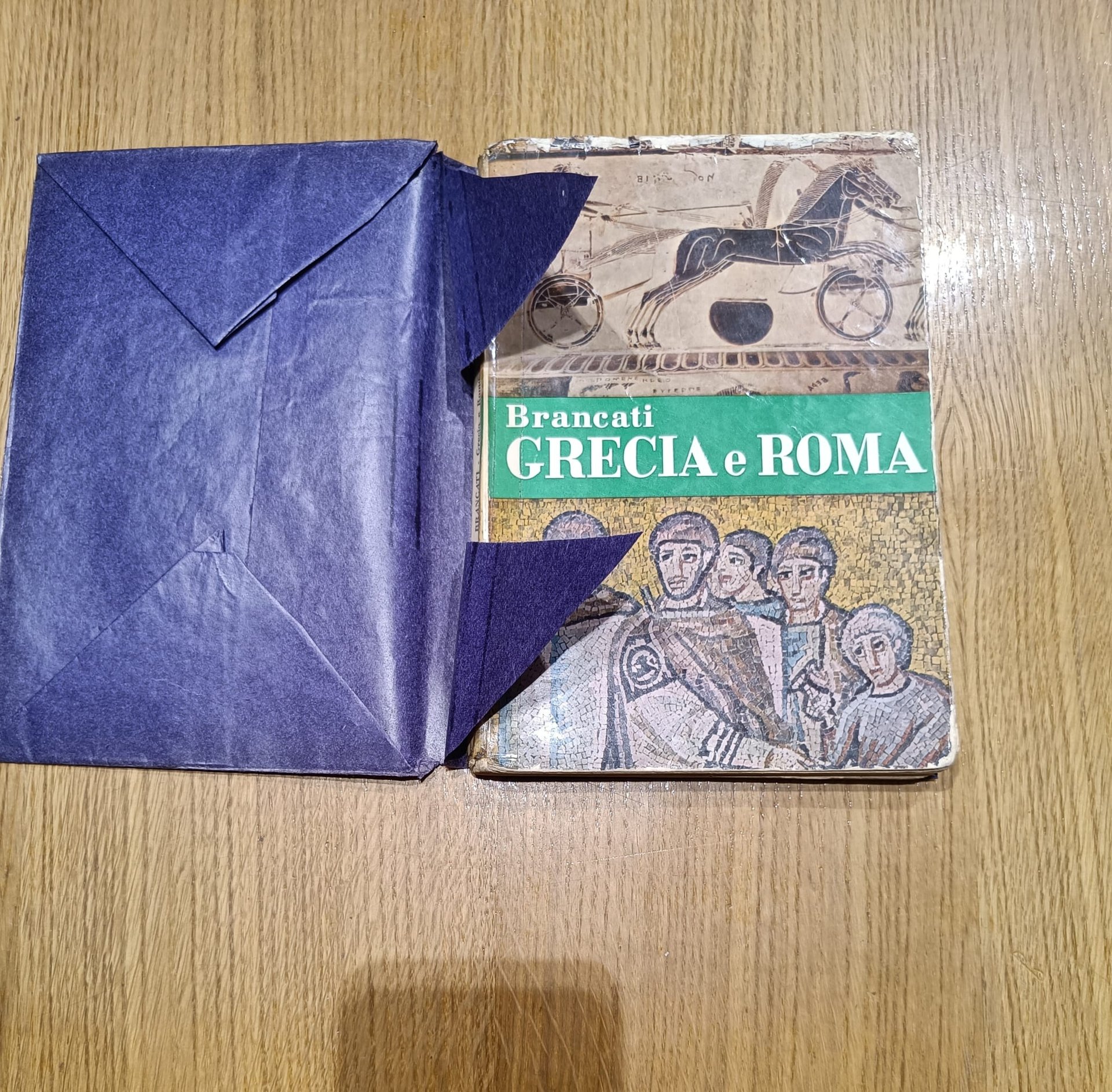 Libro scolastico di storia antica per la prima classe degli istituti magistrali. Copertina protettiva viola.