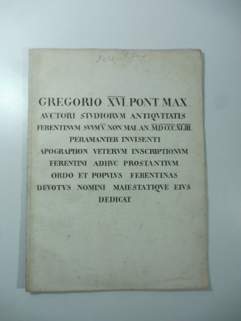 Gregorio XVI Pont. Max. auctori studiorum antiquitatis Ferentinum Svvm v non mai an. MDCCCXLIII peramanter invisenti apographon.