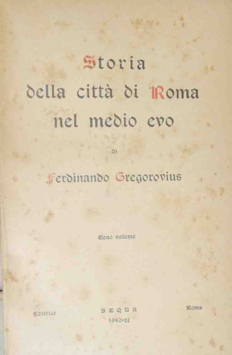 Ferdinando Gregorovius, Storia della città di Roma nel medio evo, Nono volume, Editrice Aequa, Roma 1942, nuova ed. integrale a cura di Luigi Trompeo, pp. 332, cm 20, br. ed. Nono di quattordici volumi. Titolo del volume: Storia della città di Roma nel secolo decimo terzo dal governo di Innocenzo III all’anno 1260 (i primi sei capitoli del nono libro si trovano nell’ottavo volume). Leggere tracce d’uso al dorso, fioriture, carta lievemente brunita, per il resto ben conservato. Intonso.