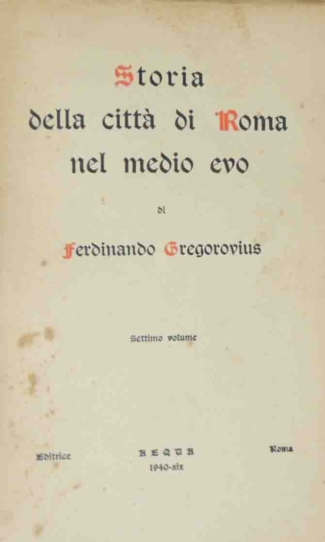 Ferdinando Gregorovius, Storia della città di Roma nel medio evo, Settimo volume, Editrice Aequa, Roma 1940, nuova ed. integrale a cura di Luigi Trompeo, pp. 364, cm 20, br. ed. Settimo di quattordici volumi. Titolo del volume: Storia della città di Roma nel secolo duodecimo. Leggere tracce d’uso al dorso, minime fioriture, carta lievemente brunita, per il resto perfetto. Intonso.