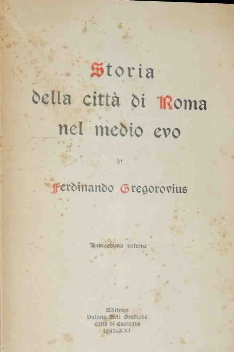 Ferdinando Gregorovius, Storia della città di Roma nel medio evo, Undicesimo volume, Editrice Unioni Arti Grafiche, Città di Castello 1943, pp. 320, cm 20, br. ed. Undicesimo di quattordici volumi. Titolo del volume: Storia della città di Roma nel secolo decimo quarto dall’anno 1305 al 1354 (i primi tre capitoli dell’undicesimo libro si trovano nel decimo volume). A partire dal presente volume l’opera è curata da Franco Caburi, che si è assunto il compito di tradurla, sguendo i testo dell’ultima ed. taedesca, e di annotarla convenientemente. Leggere tracce d’uso alla brossura, fioriture, brunititure, per il resto ben conservato. Intonso.
