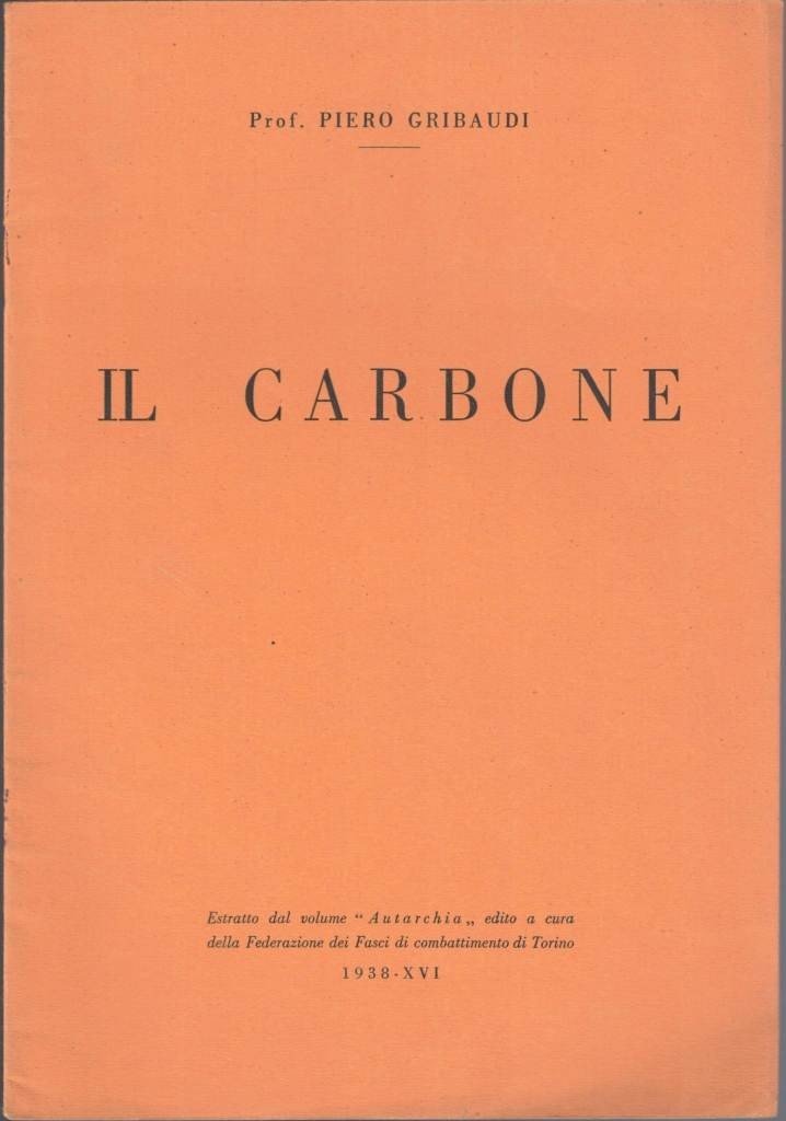 Piero Gribaudi, Il carbone, s.n., s.l. 1938 XVI, pp. 15, cm 24, rilegatura ed. a punto metallico. Estratto da Autarchia, edito a cura della Federazione dei fasci di Combattimento di Torino. Minime tracce d’uso, lievissima brunitura della carta, per il resto ben conservato.