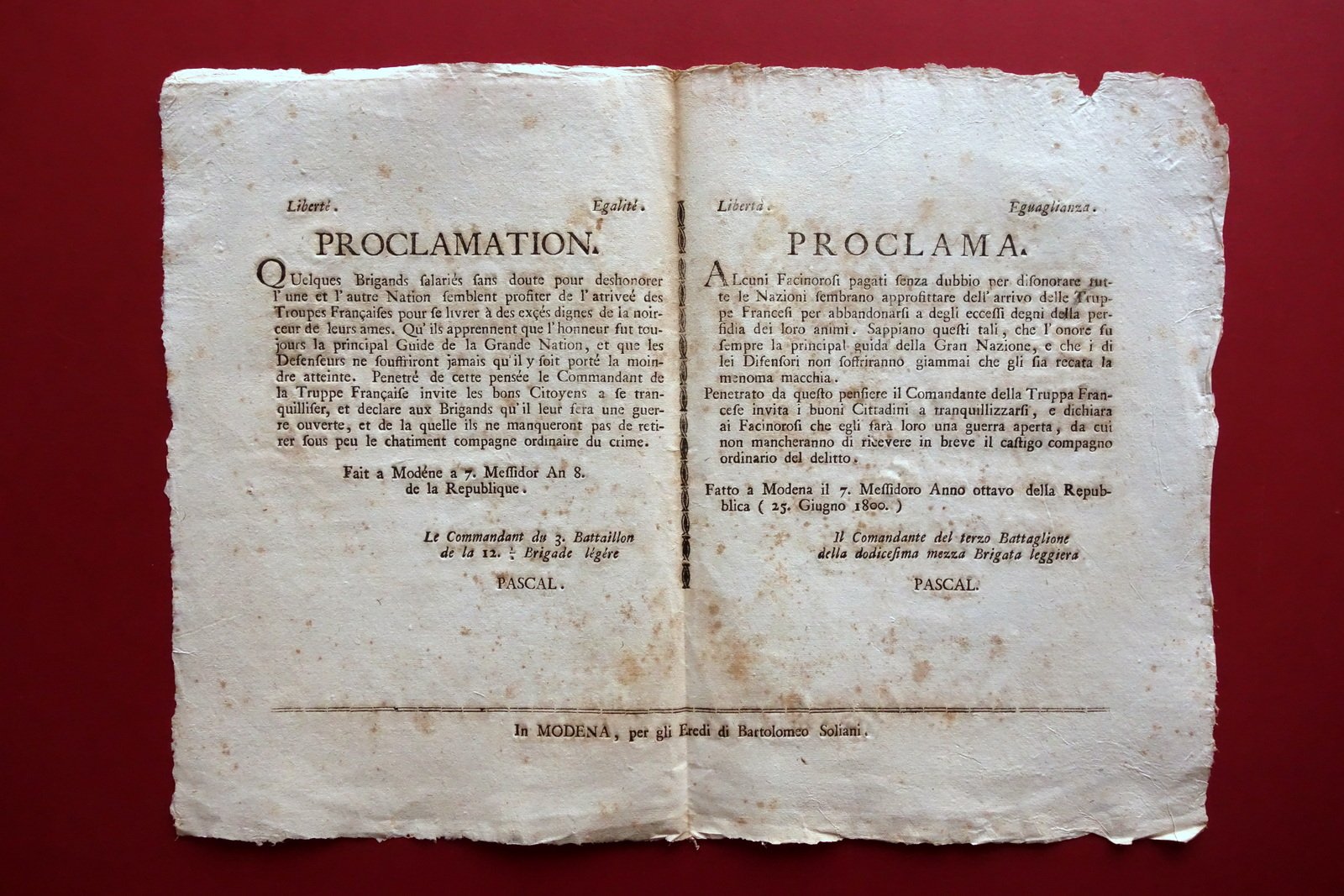 Grida Cisalpina Proclama Contro i Facinorosi Pascal Modena 1800 Bilingue Rara