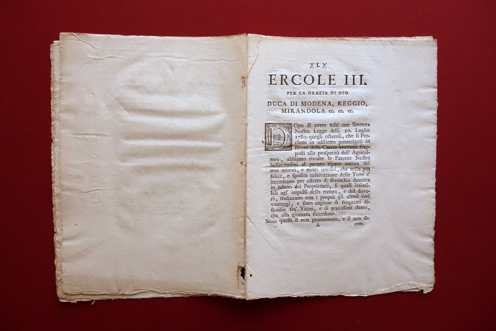 Grida, Ercole III per la grazia di Dio Duca di Modena, Reggio, Mirandola ecc. ecc. Dopo di avere tolti con Sovrana Nostra Legge delli 10 luglio 1780 quegli ostacoli, che li Proclami in addietro promulgati in favore della Caccia avevano frapposti alla prosperità dell'Agricoltura, abbiamo rivolte le Paterne Nostre Sollecitudini al pronto riparo ancora dei non minori, e molto intralci, che nella più felice, e spedita coltivazione delle Terre s'incontrano per effetto di soverchia durezza [.]" Per gli Eredi Soliani, Modena 1789; ampia grida di pp. 12 non numerate (10 con testo), con bel capolettera xilografico. Margini alla forma. Cm 30,5x23. Condizioni di conservazione Buone condizioni con qualche minuscola brunitura e alone, pagine parzialmente scucite e pertanto allentate, margine interno di qualche pagina con piccole mancanze che non interessano il testo. Per ulteriori dettagli vedi foto. Ampia serie di 12 disposizioni (10 pagine) in materia di normative agricole, per la promozione della fertilità dei campi e per l'aumento delle rese agricole a discapito della caccia. SETT199.L25632 N "