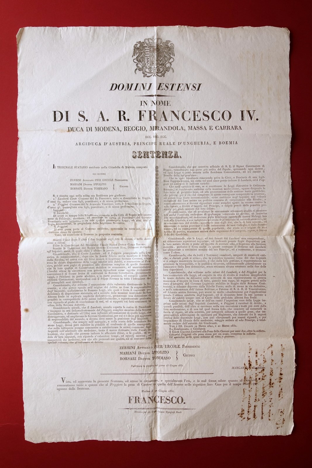 Grida Francesco IV Sentenza Condanna Lamberti Friggieri Reggio Insurrezione 1831