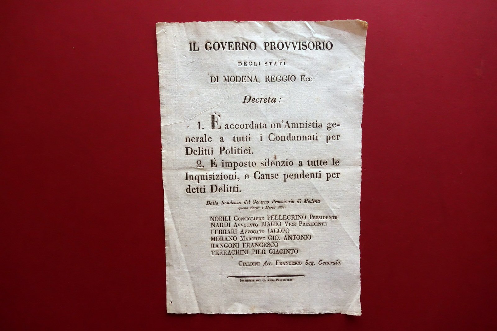 Grida, Governo Provvisorio degli Stati di Modena, Reggio, ecc. 1. è accordata un'amnistia generale a tutti i condannati per delitti politici [.]" Stamperia del Governo Provvisorio, Modena 1831; margini alla forma. Cm 31,5x21. Condizioni di conservazione Molto ben conservato con minimi segni del tempo, tre angoli con lievi tracce di pieghe. Poche trascurabili bruniture. Per ulteriori dettagli vedi foto. SC03.D19704 N "