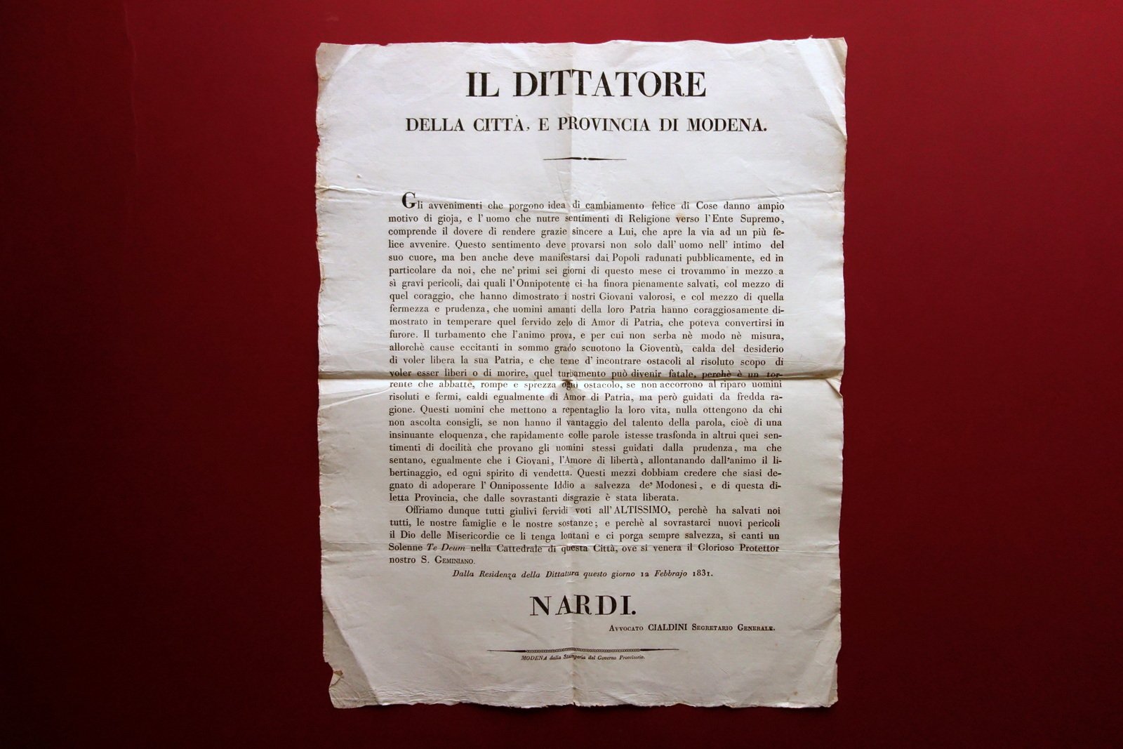 Stamperia del Governo Provvisorio, Modena 1831; grida a stampa su carta; margini alla forma. Dimensioni: cm 56,5x44,5.