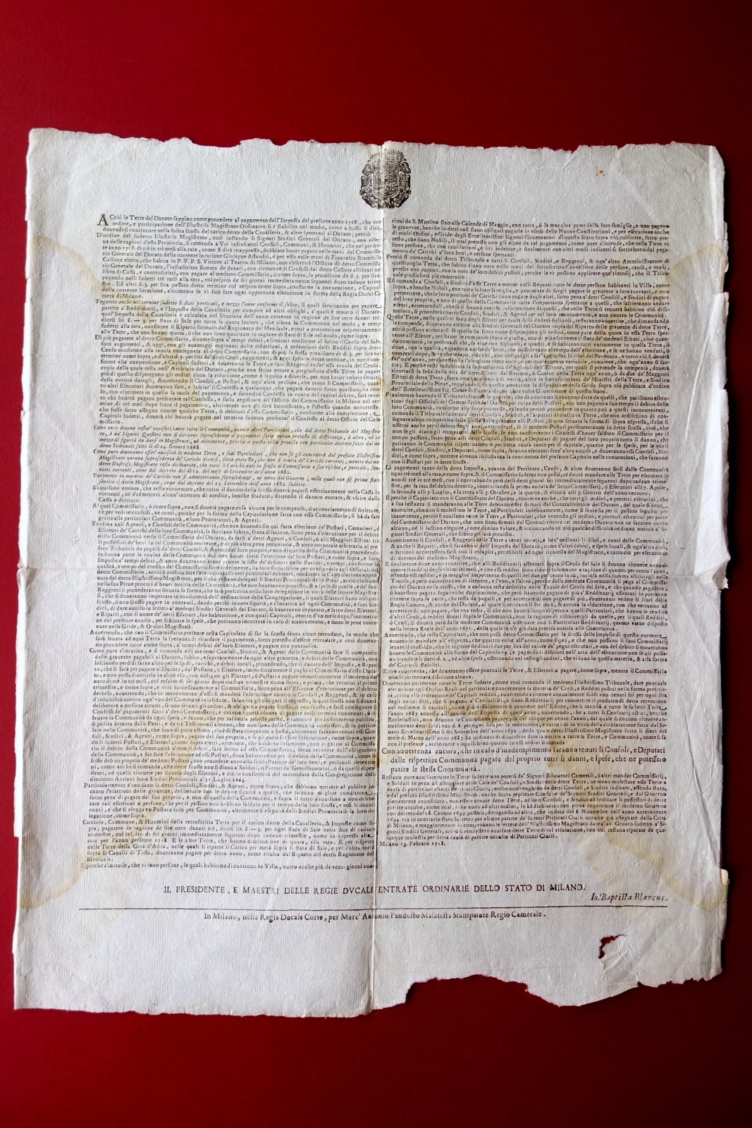 Grida, Acciò le Terre del Ducato sappino come provedere al pagamento dell'Imposta del presente anno 1718, che con ordine, e participatione dell'Illustrissimo Magistrato Ordinario si è stabilita nel modo, come a basso si dirà, dovendosi continuare nella solita scossa del carico detto della Cavalleria, et altre spettanti al Ducato; perciò d'ordine del sudetto Illustriss. Magistrato, così instando li Signori Sindici Generali del Ducato, [.]" Nella Regia Ducal Corte, per Marc'Antonio Pandolfo Malatesta Stampatore Regio Ducale, Milano 1718; cm 55x45; margini alla forma; testo su due colonne; margine sup. con piccolo stemma inciso in b/n. Condizioni di conservazione Esemplare complessivamente in buono stato con tracce d'uso, pieghe di conservazione; ampia ombra di gora che non compromette la lettura del testo (vedi foto); margini esterni con tracce di pieghette e minimi strappetti; margine inf. con un piccolo strappetto e una circoscritta mancanza che non interessa il testo. Incrocio delle pieghe di conservazione con strappetto restaurato mediante applicazione, al retro, di nastro per riparazioni cartacee. SC03.D16045 N "