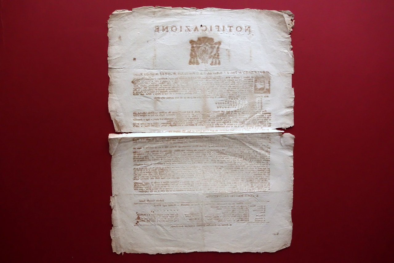 Grida, Notificazione [.] Per disporre l'amatissimo Nostro Gregge allo adempimento dell'Ecclesiastico Precetto dell'annuale Confessione, e dell'altro della Pasquale Comunione, con una fruttuosa Confessione, e fervorosa Comunione, come pure ad oggetto di preparare il cuore de' Fedeli alla Pastorale Nostra Sollecitudine dalla Divina Provvidenza raccomandati, a celebrare i Sacrosanti Misteri della Passione [.]" Per Bernardino Pomatelli Stampatore Arcivescovile, Ferrara 1784; bel fregio arcivescovile bicolore e capolettera xilografici; margini alla forma. Cm 49,5x36,5. Condizioni di conservazione Condizioni pi√π che discrete con tracce d'uso e del tempo; lievi aloni, normali leggerissimi accenni di ingiallimento della carta; ai margini alcuni piccoli strappetti e pieghette, qualche circoscritta mancanza che non coinvolge il testo. Normale piega centrale di conservazione, che presenta un taglietto di alcuni cm restaurato al retro mediante nastro per riparazioni cartacee. SC03.D19728 N F "