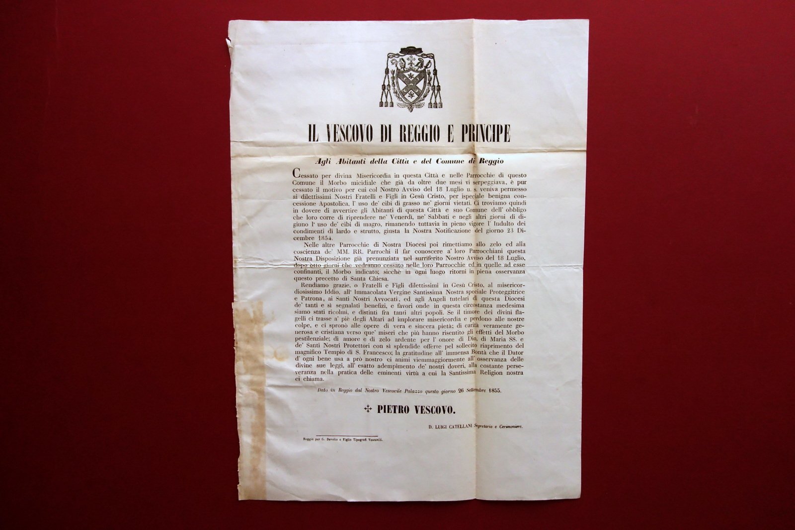 "Cessato per divina Misericordia in questa Città e nelle Parrocchie di questo Comune il Morbo micidiale che già da oltre due mesi vi serpeggiava, è pur cessato il motivo per cui col Nostro Avviso del 18 luglio u. s. veniva permesso ai dilettissimi Nostri Fratelli e Figli in Gesù Cristo, per ispeciale benigna concessione Apostolica, l'uso de' cibi di grasso ne' giorni vietati. [...]"