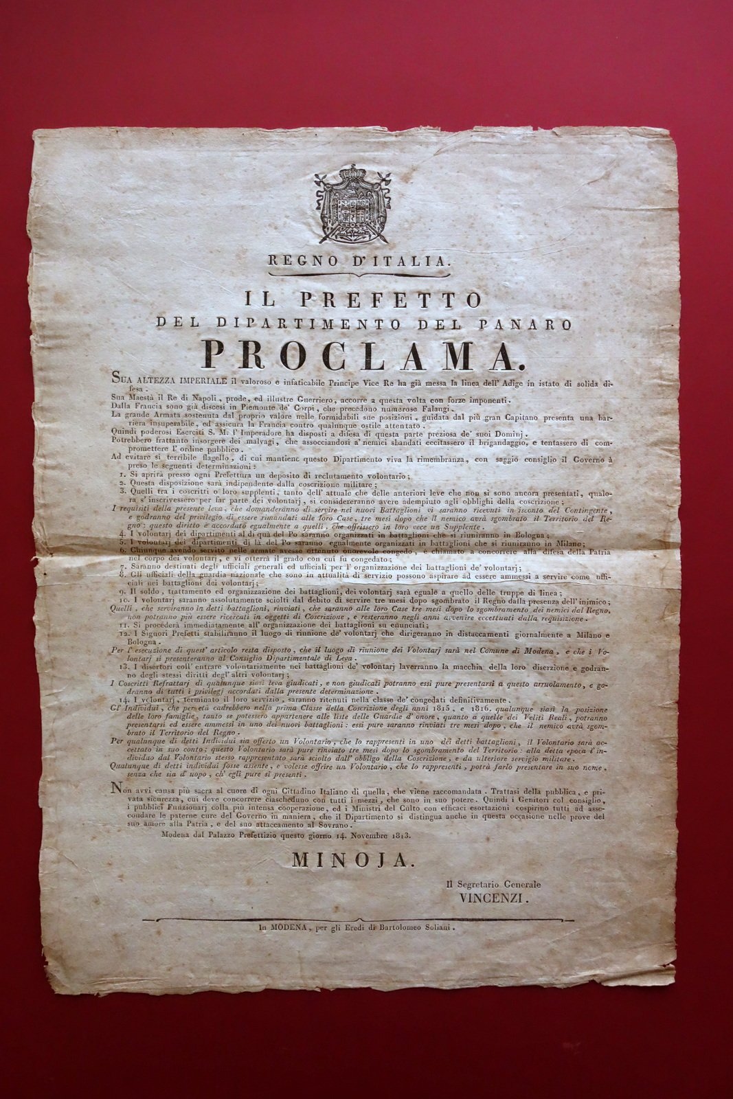 Grida Regno d'Italia Proclama Arruolamento Volontari Linea Adige Modena 1813
