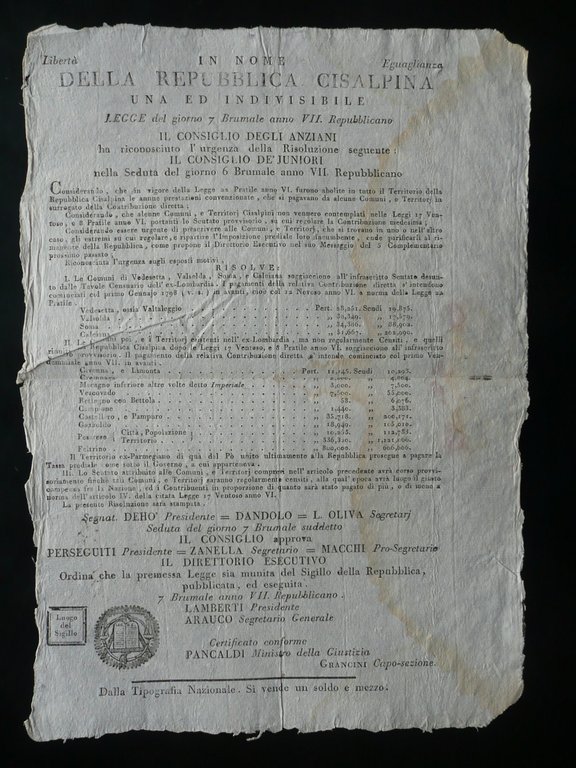 Grida, in Nome della Repubblica Cisalpina una ed indivisibile Legge del giorno 7 Brumale Anno VII Repubblicano [.] Considerando, che in vigore alla Legge 22 Pratile Anno VI furono abolite in tutto il Territorio della Repubblica Cisalpina le annue prestazioni convenzionate, che si pagavano da alcune Comuni, e Territorj in surrogato della Contribuzione diretta [.] Considerando essere urgente di prescrivere alle Comuni, e Territorj, che si trovano in uno o nell'altro caso, gli estremi su cui regolare, e ripartire l'Imposizione prediale loro incumbente, onde parificarli al rimanente della Repubblica [.] Risolve [.]" Dalla Tipografia Nazionale, 1799, cm 37x26, margini alla forma. Retro con una piccola annotazione numerica d'epoca. Condizioni di conservazione Esemplare in buone condizioni con tracce d'uso, normali pieghe di conservazione, tre angoli rispettivamente con una piccola mancanza e una leggera traccia di pieghetta, due margini con alcune lievi pieghette; poco meno di un terzo dell'esemplare interessato da una lieve ombra di gora d'umidità che non compromette la lettura del testo (vedi foto). Interessante elenco dei numerosi Comuni dell' "ex Lombardia" (e non solo), ai quali si richiede la contribuzione per il sostentamento della Repubblica, con i relativi importi richiesti (vedi foto). SC03.D10142 N "