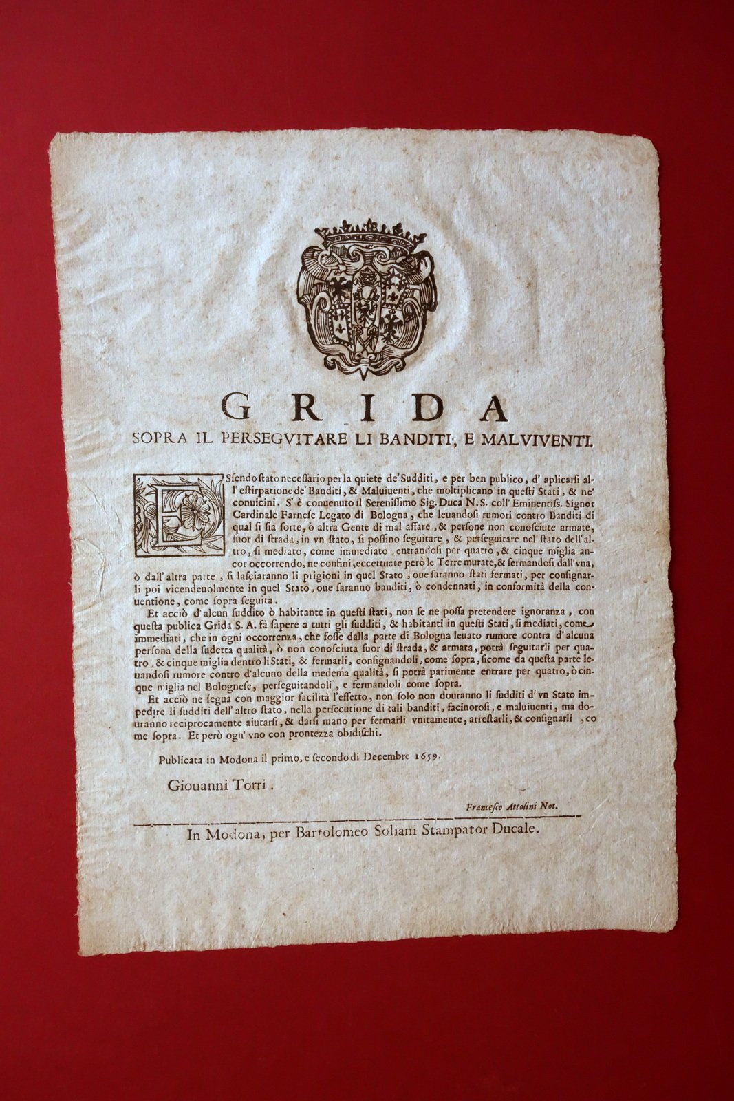 Grida Sopra il Perseguitare Li Banditi e Malviventi Soliani Modena 1659 Farnese