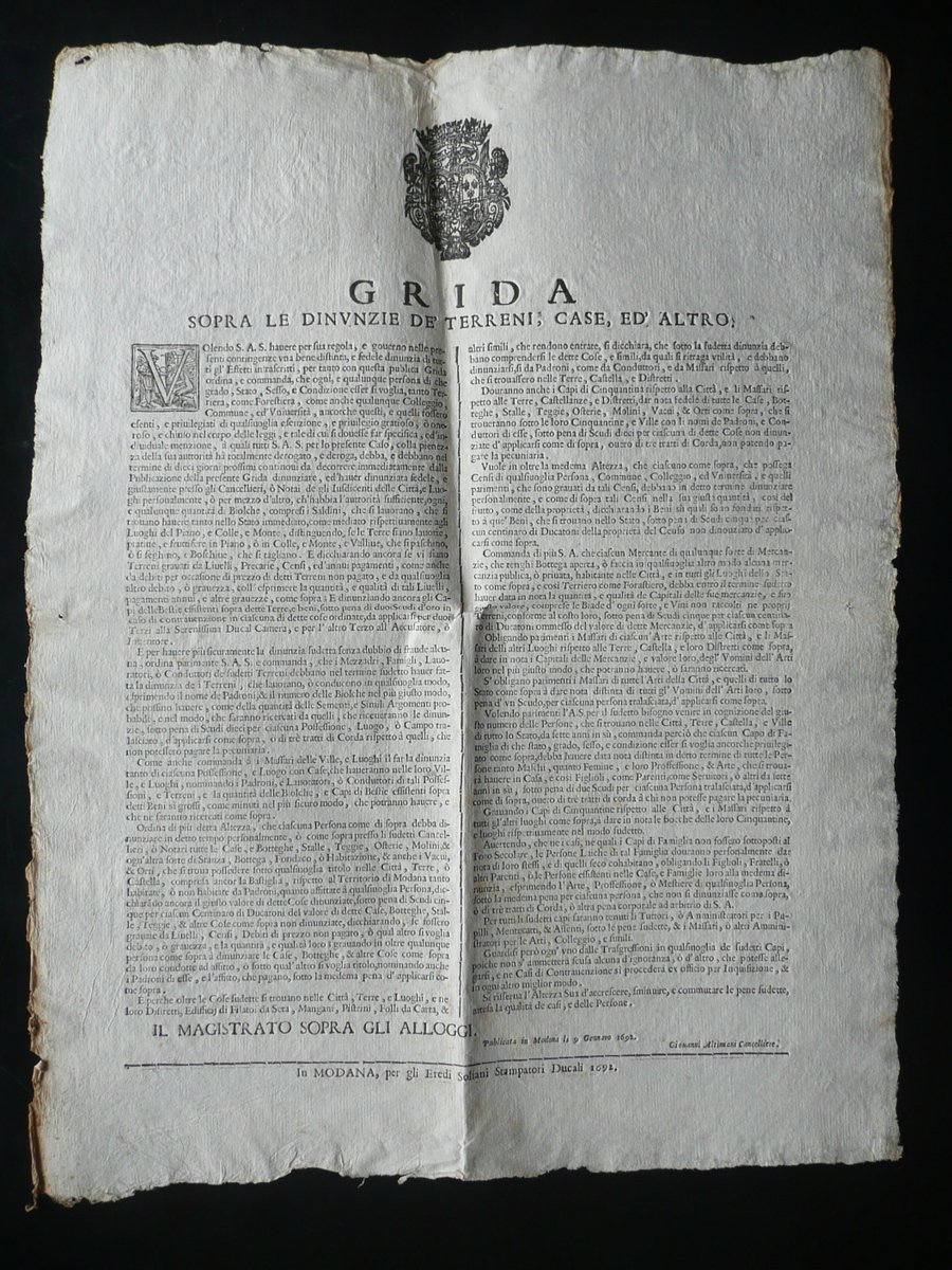 Grida, Grida Sopra le dinunzie de' terreni, case, ed altro Volendo S. A. S. havere per sua regola, e governo nelle presenti contingenze una bene distinta, e fedele dinunzia di tutti gl'Effetti intrascritti, per tanto con questa pubblica Grida ordina, e comanda, che ogni, e qualunque persona [.] tanto Terriera, quanto Forestiera [.] debbano nel termine di dieci giorni prossimi continoui da decorrere immediatamente [.] Denunziare, ed'haver dinunziata fedele, e giustamente [.] ogni e qualcunque quantità di Biolche, compresi i Saldini, che si lavorano, che si trovano avere [.]" Per gli Eredi Soliani Stampatori Ducali, Modena 1692, cm 47,5x37; margini alla forma; testo su due colonne; capolettera e uno stemma incisi. Condizioni di conservazione Esemplare in buone condizioni con tracce d'uso, normali pieghe di conservazione, qualche minima leggerissima brunitura; margini alla forma con pochi minimi strappetti; margini est. entrambi con un minuscolo e speculare forellino probabilmente dovuto a precedente conservazione entro raccolta. Interessante grida che riguarda l'obbligo di denuncia di terreni, case, botteghe, osterie, molini e altri beni immobili posseduti nel territorio di Modena, compresa la Bastiglia. L'obbligo vale sia per i "Terrieri" che per i "forestieri". Descrizioni numerose e dettagliate. SC03.D10522 N "