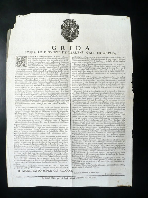 Grida, Grida sopra le dinunzie de' terreni, case, ed altro Volendo S. A. S. havere per sua regola, e governo nelle presenti contingenze una bene distinta, e fedele dinunzia di tutti gl'Effetti infrascritti, per tanto con questa publica Grida ordina, e comanda, che ogni e qualunque persona [.] debba, e debbano nel termine di dieci giorni prossimi continuoi da decorrere immediatamente dalla publicazione della presente Grida dinunziare, ed haver dinunziata fedele, e giustamente [.] ogni, e qualunque quantità di biolche [.] Per gli Eredi Soliani Stampatori Ducali, Modena 1692; cm 44,5x32,5; testo su due colonne, bel capolettera e stemma Estense incisi. Condizioni di conservazione Esemplare ben conservato con tracce d'uso, pieghe di conservazione, qualche piccola lieve brunitura, un margine esterno con un paio di minime mancanze, angolo sup. sinistro con circoscritta mancanza che non interessa il testo (vedi foto), poche tracce di pieghette. Grida molto dettagliata e specifica, con indicati numerosi tipi di immobili da denunciare: filatoi, mulini, osterie, stalle, ecc. SC03.D13412 N "