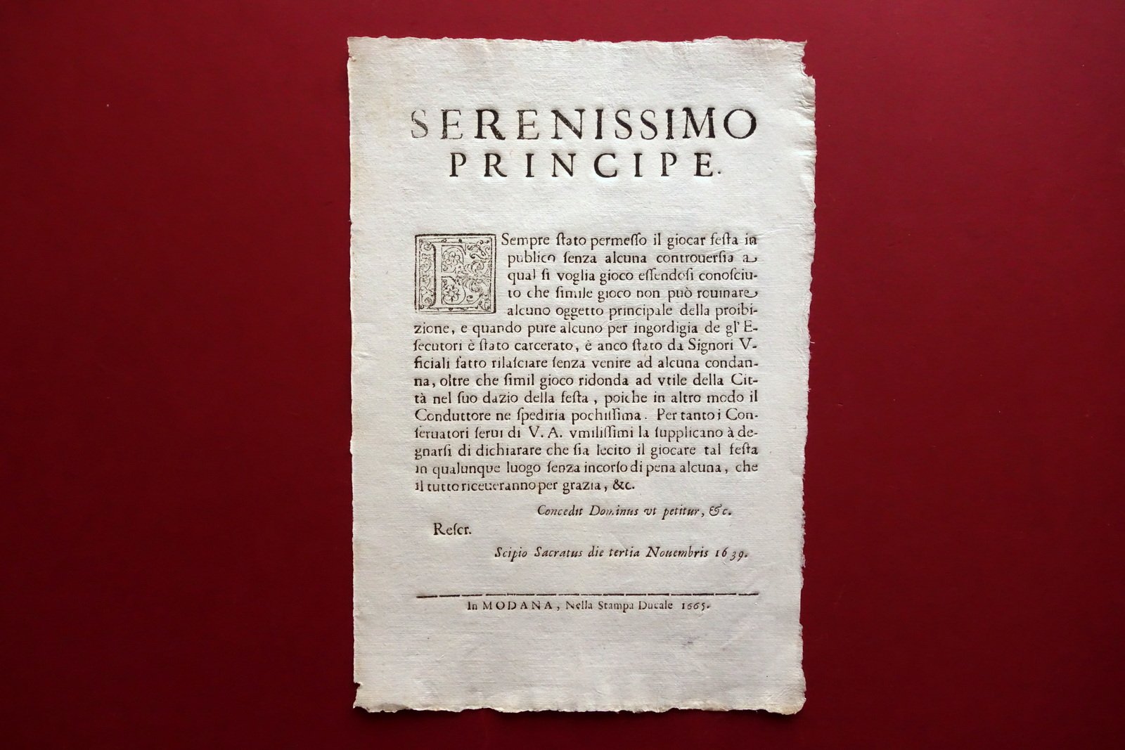 Grida, Serenissimo Principe è sempre stato permesso il giocar festa in publico senza alcuna controversia a qual si voglia gioco essendosi conosciuto che simile gioco non può rovinare alcuno oggetto principale della proibizione, e quando pure alcuno per ingordigia de gl'Esecutori è stato carcerato, è ancor stato da Signori Ufficiali fatto rilasciare [.]" Nella Stampa Ducale, Modena 1665; bel capolettera xilografico, margini alla forma. Cm 28,5x19. Condizioni di conservazione Complessivamente molto ben conservato con minimi segni del tempo, una minuscola mancanza all'angolo superiore destro, minime pressoché trascurabili bruniture. SC03.D19702 N "