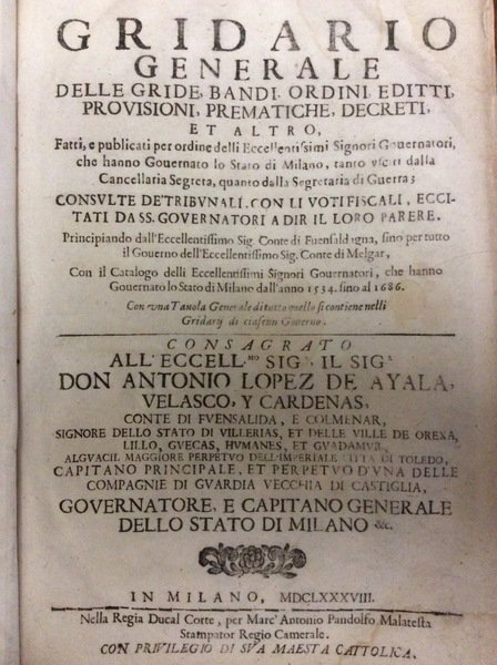 GRIDARIO GENERALE DELLE GRIDE, BANDI, ORDINI, EDITTI, PROVISIONI, PREMATICHE, DECRETI ET ALTRO. - Fatti e publicati per ordine delli Eccell.mi Signori Governatori che hanno governato lo Stato di Milano, tanto usciti dalla Cancellaria Segreta, quanto dalla Segretaria di Guerra; consulte de' tribunali, con li voti fiscali, eccitati da SS. Governatori a dir il loro parere.... ... Con una tavola generale di tutto quello si contiene nelli Gridarij di ciascun Governo.