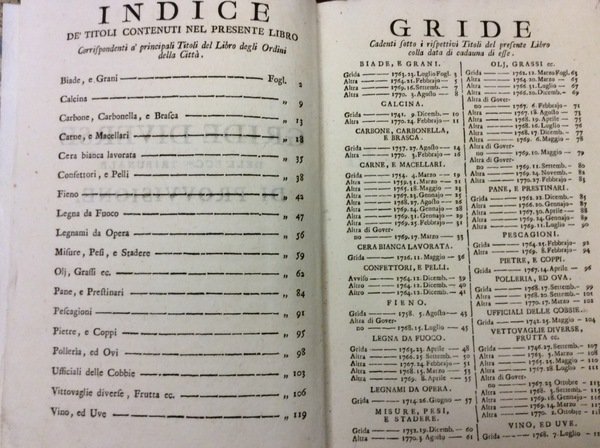 In- 4 gr. (mm. 340x215), mz. pelle coeva (dorso e piatto anter. lievam. danneggiato nella parte infer.), filetti e titolo oro su tassello al dorso, 122 cc.nn. Vi sono contenute le seguenti gride (Titoli corrispondenti a' principali Titoli del Libro degli Ordini della Città), datate 1714/1770, ciasc. ornata da uno stemma e grande iniziale decorata a vignetta, inc. su legno: Biade, e grani - Calcina - Carbone, Carbonella, e Brasca - Carne, e Macellari - Cera bianca lavorata - Confettori, e Pelli - Fieno - Legna da Fuoco - Legnami da opera - Misure, Pesi e Stadere - Olj, Grassi ec. - Pane, e Prestinari - Pescagioni - Pietre, e Coppi - Polleria, ed Ovi - Ufficiali delle Cobbie - Vittovaglie diverse, Frutta ec. - Vino, ed Uve. Fresco esemplare ben conservato, con importante ex libris.