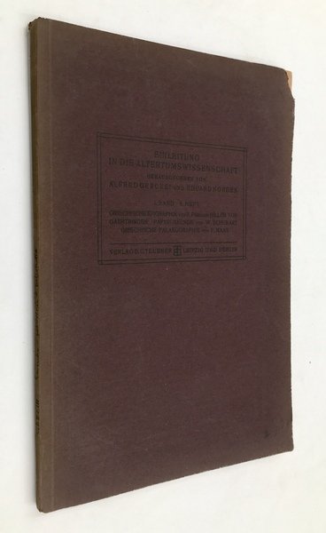"Einleitung in die Altertumwissenschaft" herausgegeben von Alfred Gercke und Eduard Norden unter Mittwirkung Zahlreicher Fachgenossen. II. Band, 3. Heft, del tutto a sé stante. In-8° (cm. 24,8), pp. 81. Cartoncino leggero editoriale, HILLER (Berlin 1864 - Thurnau 1947), filologo epigrafista ed archeologo, genero di Ulrich von Wilamowitz-Moellendorff, scavò in Magnesia e Meandro. lavorò su segnalazione di Mommsen alle Inscriptiones Graecae ecc. SCHUBART, Liegnitz 1873-1960), luminare della papirologia MAAS (Francoforte sul Meno 1880 - Oxford 1964) grande filologo classico (celeberrimo per la sua "Textkritik" del 1927) e linguista, espulso dai nazisti perché ebreo dal 1939 visse poveramente a Oxford producendo opere di enorme prestigio. Ottimo es.