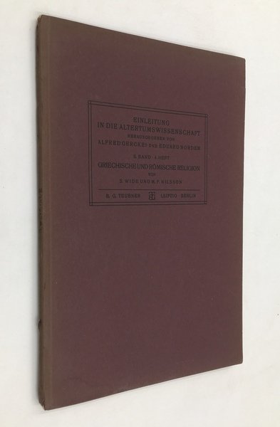 "Einleitung in die Altertumwissenschaft" herausgegeben von Alfred Gercke und Eduard Norden unter Mittwirkung Zahlreicher Fachgenossen. 4. Auflage. II. Band, 3. Heft, del tutto a sé stante. In-8° (cm. 24,8), pp. 101. Cartoncino leggero editoriale, Ottimo es. WIDE (Stora Tuna, 1861 - Upsala 1918), ilologo e archeologo svedese, tra il 1893 e il 1895, in Italia, in Asia Minore, in Grecia, dove diresse degli scavi, a Calauria e ad Afidne. Si occupò particolarmente di antichità religiose e di storia della religione greca. NILSSON (Stoby 1874 - Lund 1967) filologo classico, grecista e storico delle religioni svedese.