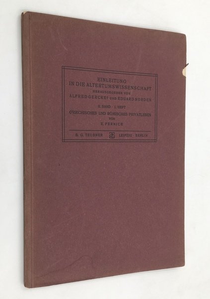 "Einleitung in die Altertumwissenschaft" herausgegeben von Alfred Gercke und Eduard Norden. 4. Auflage. II. Band, 1. Heft, del tutto a sé stante. In-8° (cm. 24,8), pp. 87. Cartoncino leggero editoriale, piccola tacca al piatto anteriore, ma eccellente es. Fonti e considerazioni generalei. La CASA. omerica, del periiodo classico, ellenistico, italico e romano. l'ARREDAMENTO INTERNO, ,l'ABBIGLIAMENTO maschile e femminile, cretese e miceneo, omerico, greco classico nei vari periodi, romano Calzature, acconciature, barba. NASCITA, MORTE, SEPOLTURA. Le ARMI OMERICHE. Rilevante studio di Erich Anton PERNICE, filologo ed archeologo, visitò Italia (Roma, Pompei,Sicilia), seguì scavi pompeiani, ateniesi e di Mileto, specialista in pesi e misure antichi, protagonista nei grandi Musei Berlinesi, docente a Grefswald, Strassburg, Breslau. Opera di riferimento!